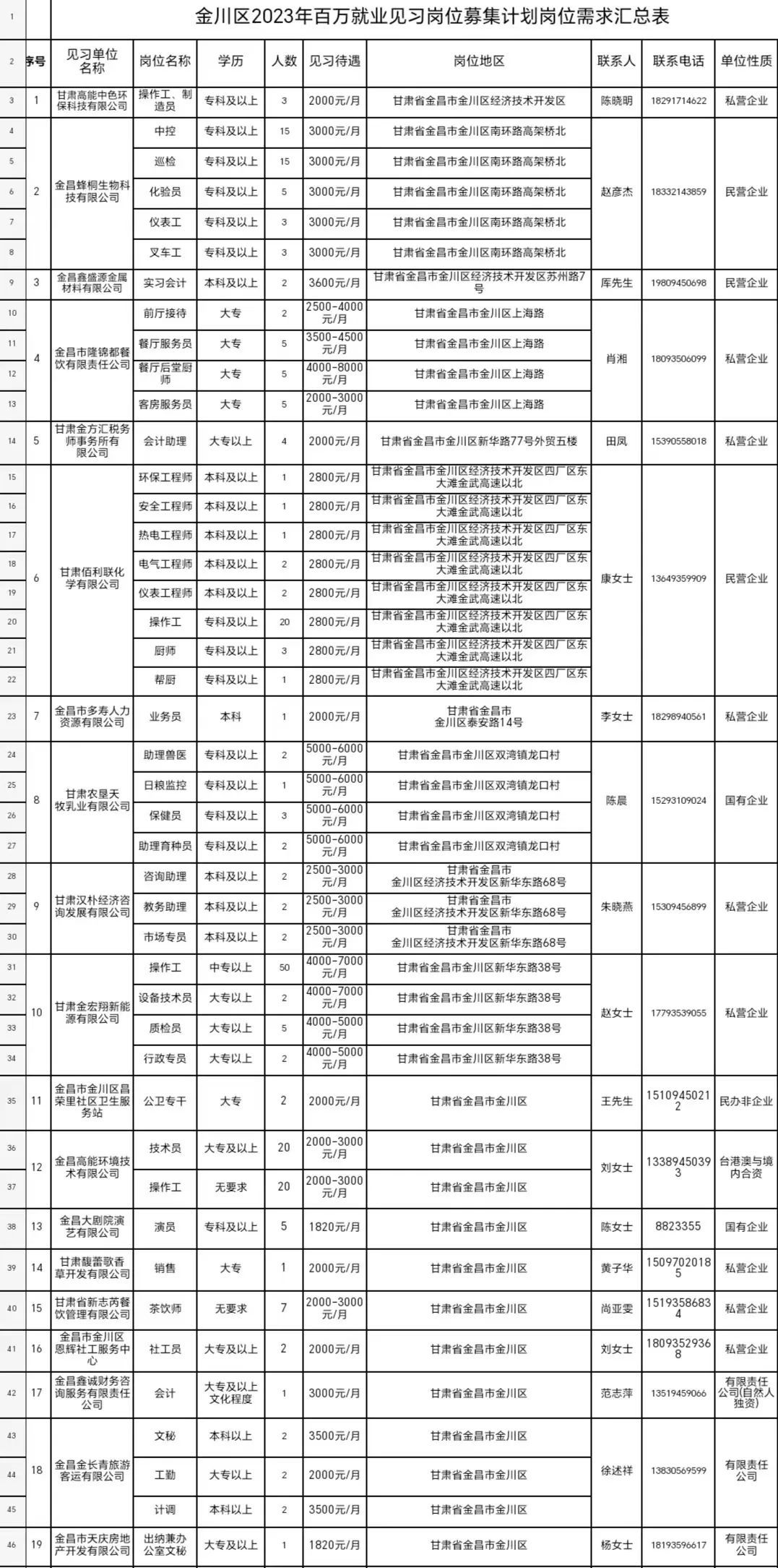 为进一步促进未就业高校毕业生等青年群体和用人单位更好实现双向对接,提高青年社会实践和创新能力,增强青年就业竞争力,根据《关于落实“百万就业见习岗位募集计划”有关工作的通知》(金人社发〔2022〕89)文件精神,金川区人社局面向社会征集了19家企业的180个见习岗位。现将见习岗位公告如下: