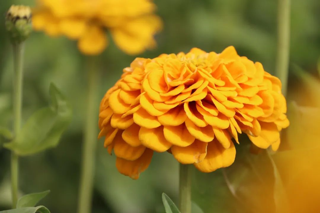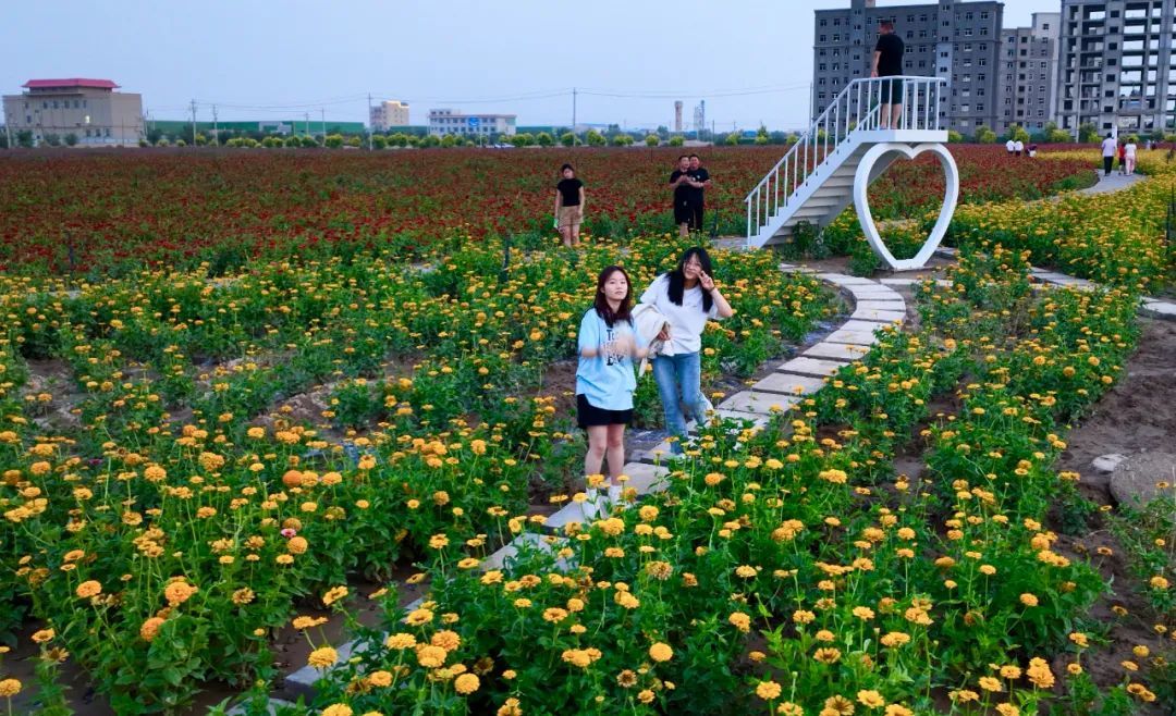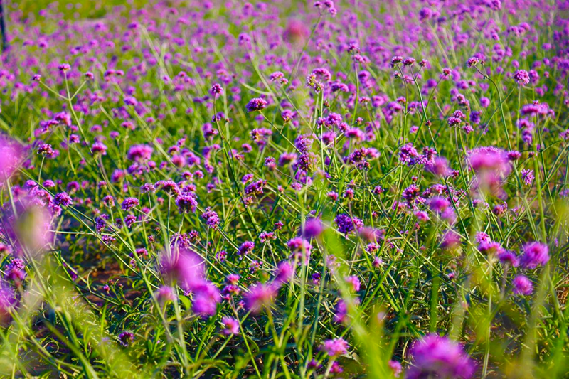 徜徉花海,满园的百日菊、柳叶马鞭草竞相绽放,红似火、黄如金、紫成烟、粉赛霞,千姿百态,五彩缤纷,宛若童话仙境里的花园。