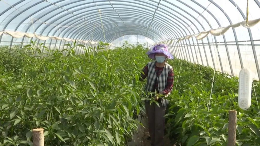 在靖远县若笠乡碾湾坪安置区的蔬菜大棚基地,一排排绿油油的辣椒长势旺盛,村民们穿梭在辣椒丛中,忙着采摘辣椒。