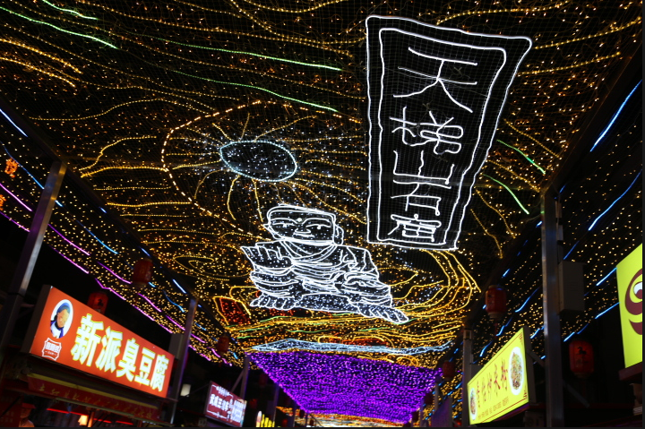 人间烟火、最抚人心。深夜的明清街夜市如一颗繁星,点亮武威的夜。街道两旁摊位林立,头顶彩灯闪耀,细心的游客还会发现头顶的彩灯装饰呈现有武威的特色景点,随便一拍,都很出片。