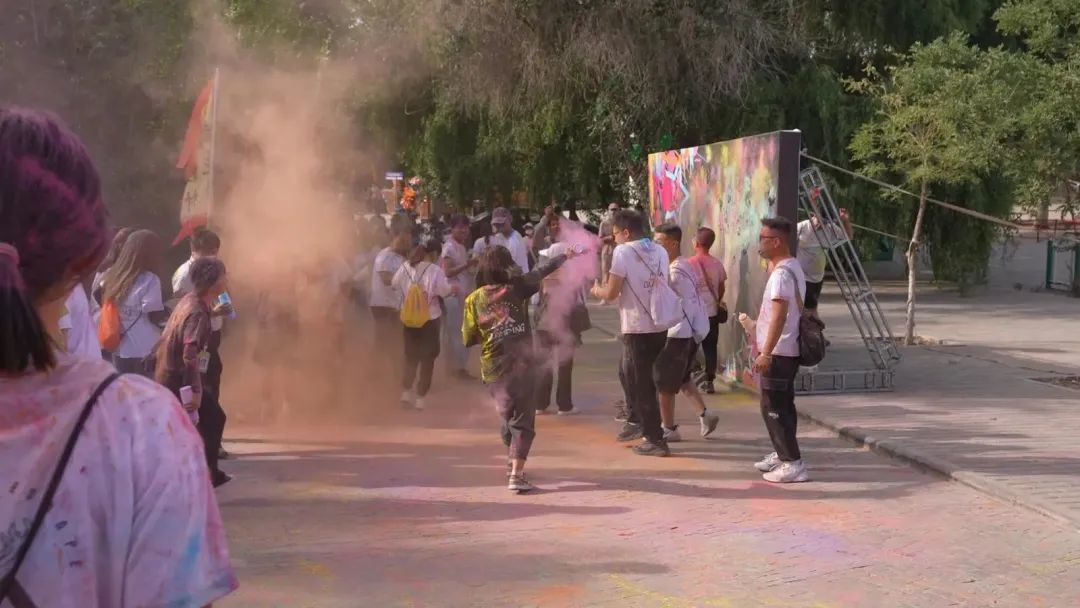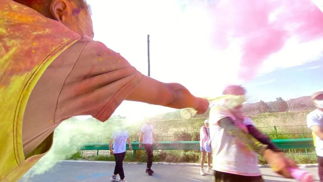 彩虹跑过程中,跑者一边跑步,一边用手中食用色素和玉米粉混合制成的彩色涂料向其他跑者喷撒。各色涂料散落在跑者身上,把衣物染得绚丽多彩,跑道上也满是绚烂的彩虹与舞动的青春。