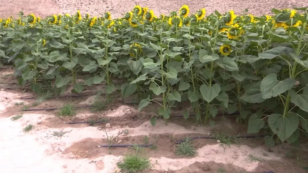 “这一片大概有400多亩地,全部实施了滴水灌溉工程,主要种植油料作物油葵,目前长势旺盛。”