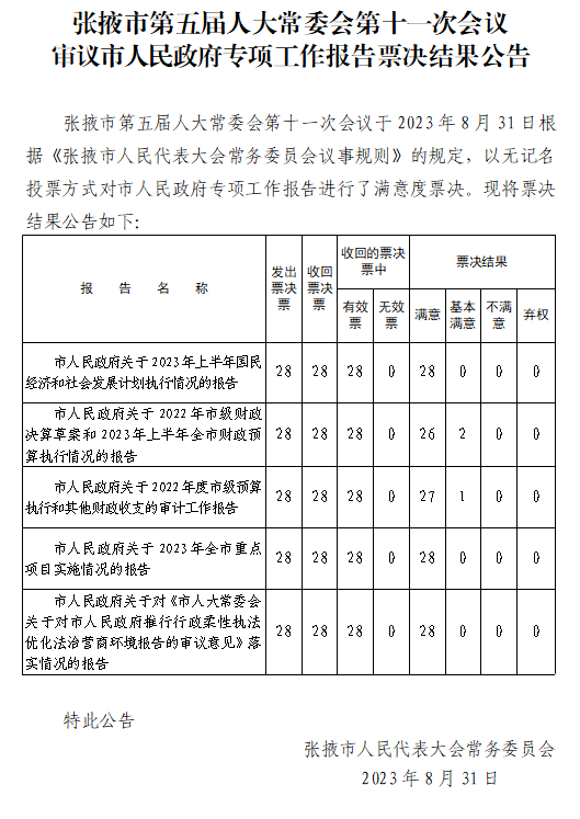 会议听取审议并表决通过了张掖市社会信用体系建设促进条例(草案表决稿)、张掖市农田防护林建设管理条例(草案表决稿)、张掖市人大常委会关于批准2022年市级财政决算的决议(草案)、关于设立“张掖企业家日”的决定(草案)、关于加强湿地保护管理的决定(草案)》和人事任免议案,听取审议了市人民政府关于 2023 年上半年全市经济社会发展情况的报告、关于2023年上半年国民经济和社会发展计划执行情况的报告、关于2022年市级财政决算草案和2023年上半年全市财政预算执行情况的报告、关于2022年度市级预算执行和其他财政收支的审计工作报告、关于2023年全市重点项目实施情况的报告、关于对《市人大常委会关于对市人民政府推行行政柔性执法优化法治营商环境报告的审议意见》落实情况的报告,并进行了满意度票决。审议了市人大常委会调研组关于“双千”行动的报告和市人大常委会执法检查组关于检查《中华人民共和国行政处罚法》实施情况的报告。