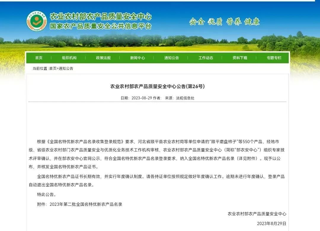 农业农村部农产品质量安全中心发布公告