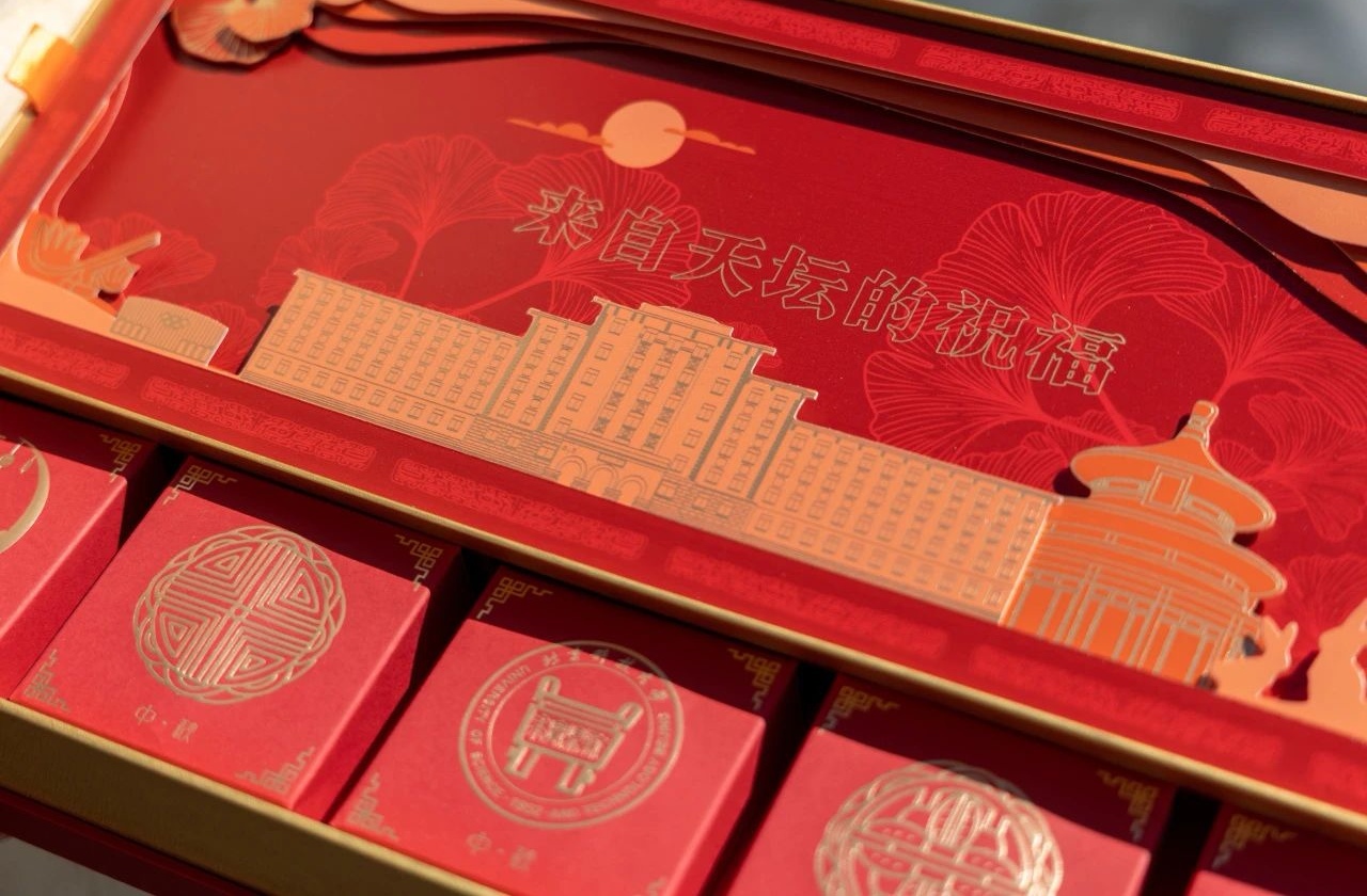 北京科技大学联名天坛推出“月圆北科”特色月饼套装。“来自天坛的祝福”月饼套装整体以绛红铺色晕染,外部饰以烫金元素,应用北科大校徽与天坛图案,搭配鼎、体育馆、银杏,祥云纹、玉兔等特色元素,以剪影镂空方式体现绣闼雕甍。内置9枚月饼,5种造型5种口味。