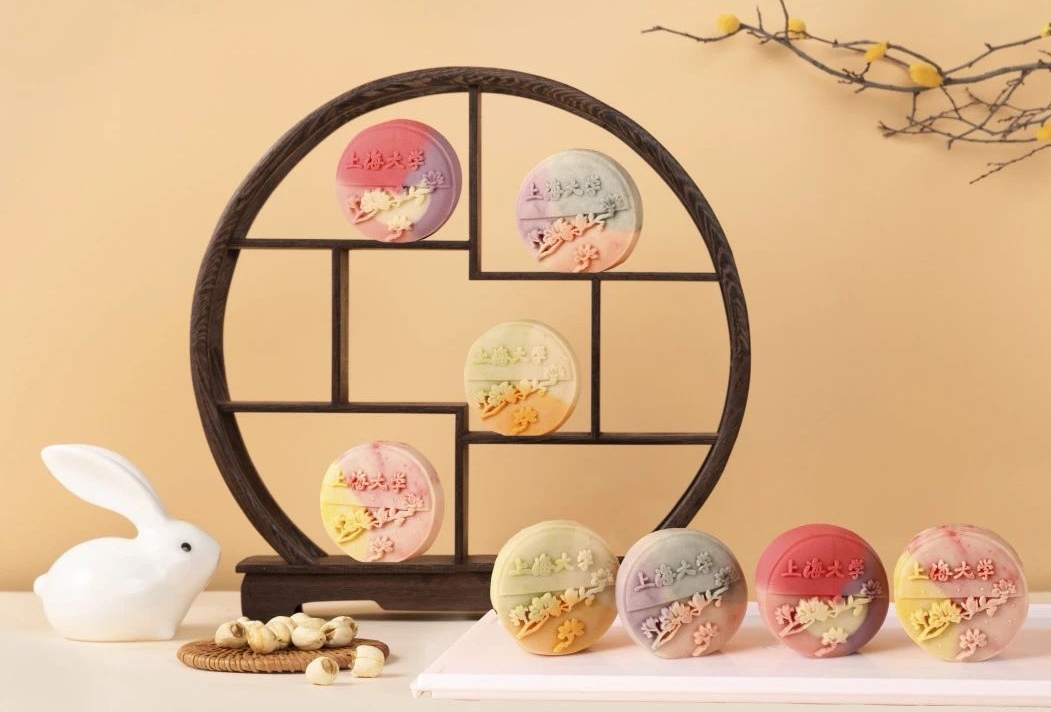 上海大学新款上大logo专属月饼,既有豆沙、五仁、清香莲蓉、奶黄椰蓉四种传统广式款,还有特色流心款:炭烧果仁咖啡雪媚娘流心、黑米秋耳雪媚娘流心、牛油果核桃雪媚娘流心、雪耳玫瑰雪媚娘流心。
