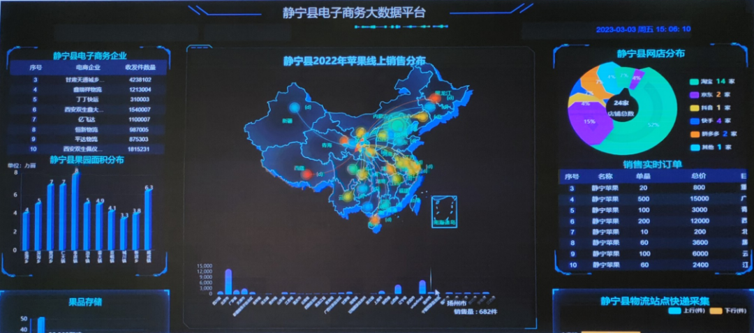该县在阿里巴巴、京东、苏宁、子旅等国内平台入驻店铺2900家,打造了京东商城静宁扶贫馆、苏宁易购静宁扶贫馆、静宁苹果旗舰店、红六福静宁苹果旗舰店、京东陇原红旗舰店、天猫臻果鲜生、村长宣言等网店,培育各类电商企业370家。在北京、重庆、上海等大中型城市设立静宁苹果品牌形象店、直营店15家,创建营销网店110家,构建了线上线下融合发展的市场体系。积极发展跨境电商,静宁苹果以跨境电商B2B模式出口印度尼西亚、阿联酋等多个国家。