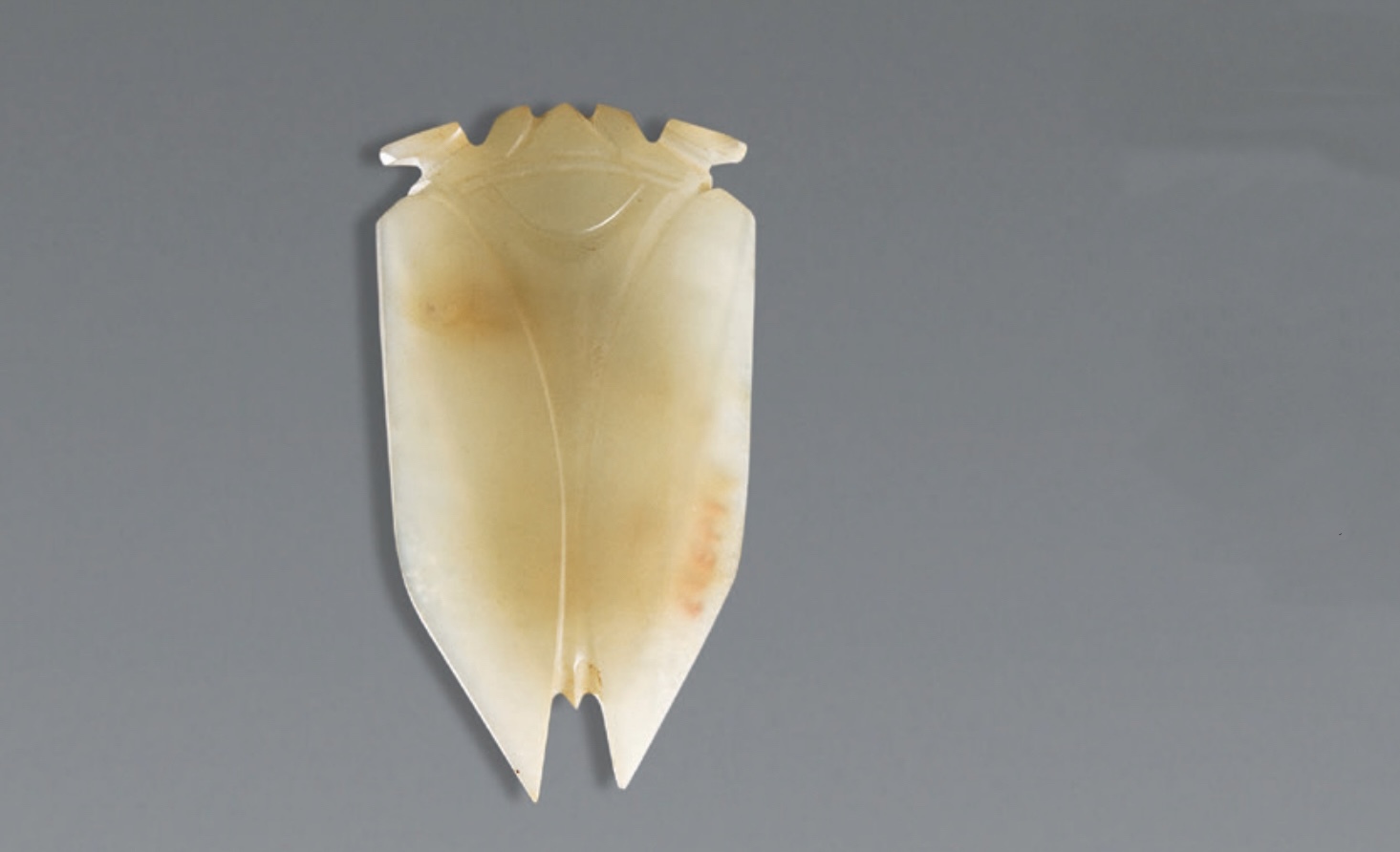 与白草坡西周墓出土的这件造型古拙的玉蝉相比,甘肃省博物馆收藏的另一件青玉玉蝉,则出土于武威市磨嘴子汉墓。其玉质纯净细润,玉蝉背弧鼓微凸,腹较平,头微弧圆,三瓣嘴出尖,两侧各有一外斜面的不规则椭圆形眼。颈部有两道斜弧线,颈后有一半圆弧,背部用两条双面坡状长弧槽刻出合收的双翼,两侧似钝刃,中脊有直棱,尾尖和两翅末端呈三尖状突出。腹面中部刻有两道交叉阴线纹。造型简约,对称匀美,是汉代玉器中使用“八刀”法的典范之作。