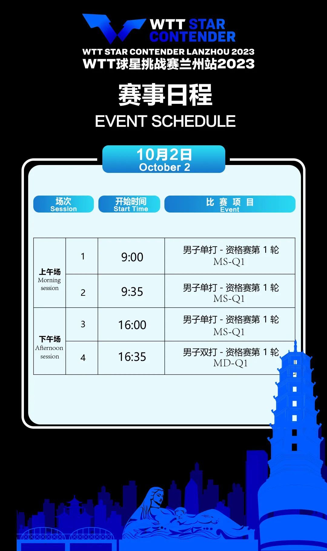 【本报讯】10月1日,记者从WTT球星挑战赛兰州站2023组委会获悉,本次赛事于今日正式开赛,这场赛事亮点十足、看点十足,有两个“首次”,有最强阵容,10月2日至8日期间,广大球迷将相约兰州,在兰州奥体中心郁金香综合馆共同见证精彩。