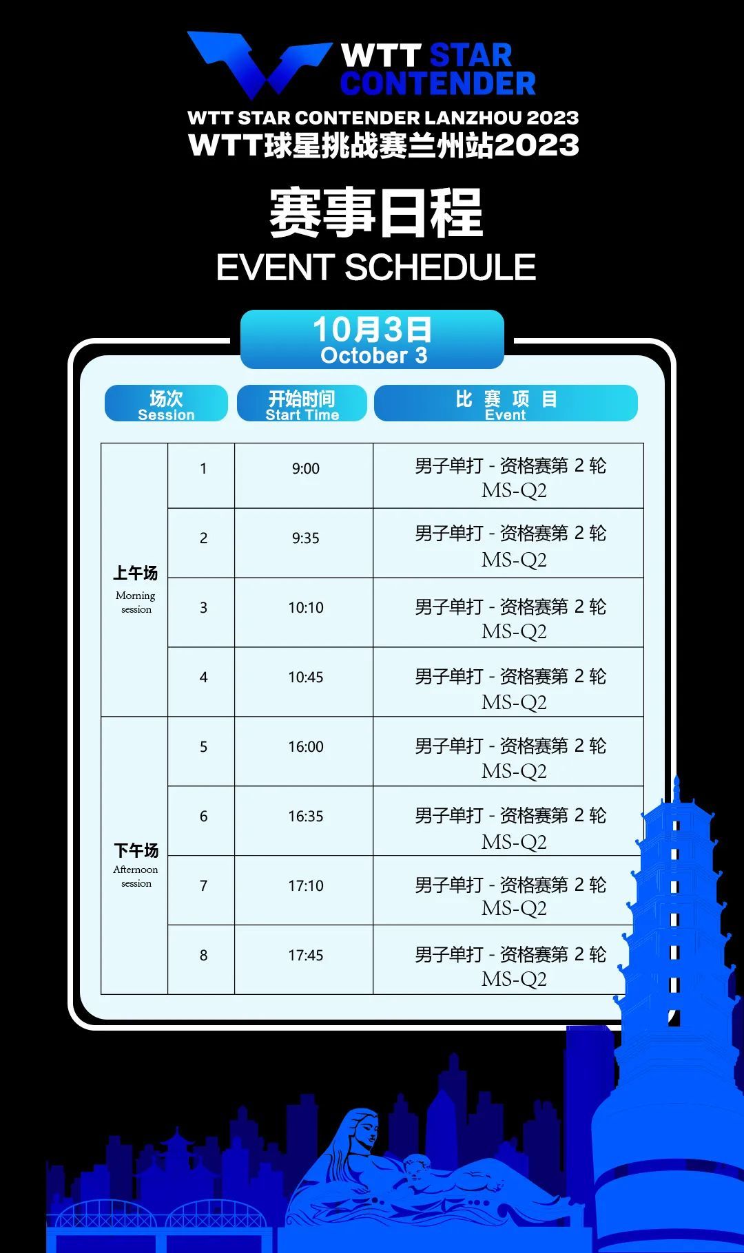 10月2日——8日,WTT球星挑战赛兰州站2023将在兰州奥体中心郁金香综合馆举行。此次WTT球星挑战赛是该级别赛事首次在中国举办,也是首次落户兰州。作为本年度WTT球星挑战赛继印度果阿、泰国曼谷和斯洛文尼亚的卢布尔雅之后的第4站,此次赛事冠军将获得600分的世界排名积分。