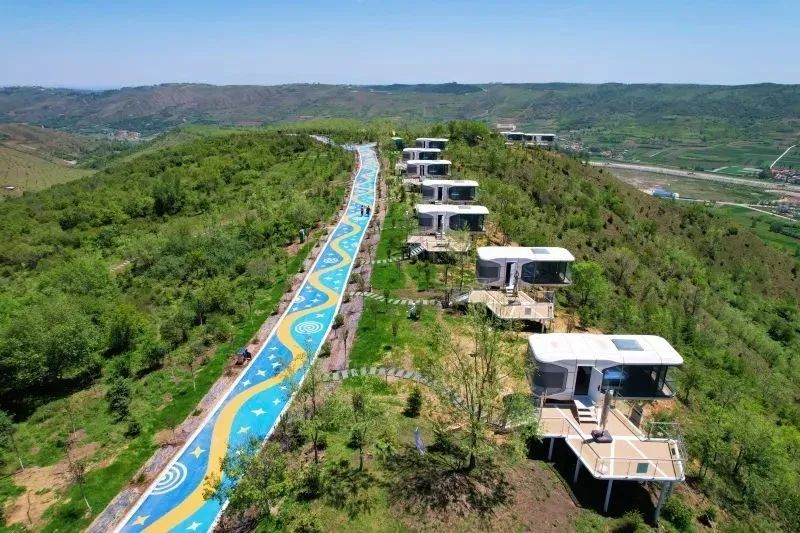 星语云端,这里有太空舱式高档民宿、木屋式生态民宿、帐篷酒店式民宿和星月居科幻主题民宿组成的民宿集群伫立山梁,在夜晚游客只要躺在床上,漫天银河繁星便一览无遗。而站在屋外的阳台上,松鸣小镇的全景尽收眼底。