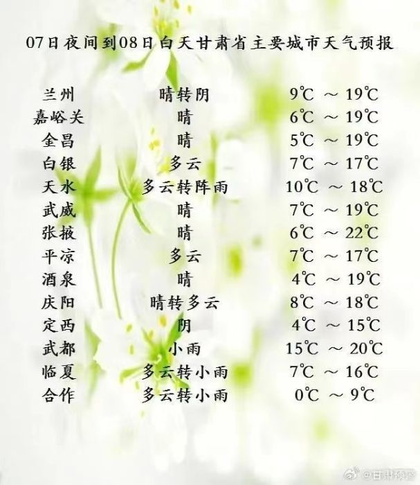 10月7日夜间到10月8日白天,甘南州多云转晴,部分地方阴有小雪(雨);陇南、天水两市及定西市南部、兰州市南部多云转晴,部分地方阴有小雨;省内其余地方晴或多云,河西五市有4至5级偏东风。