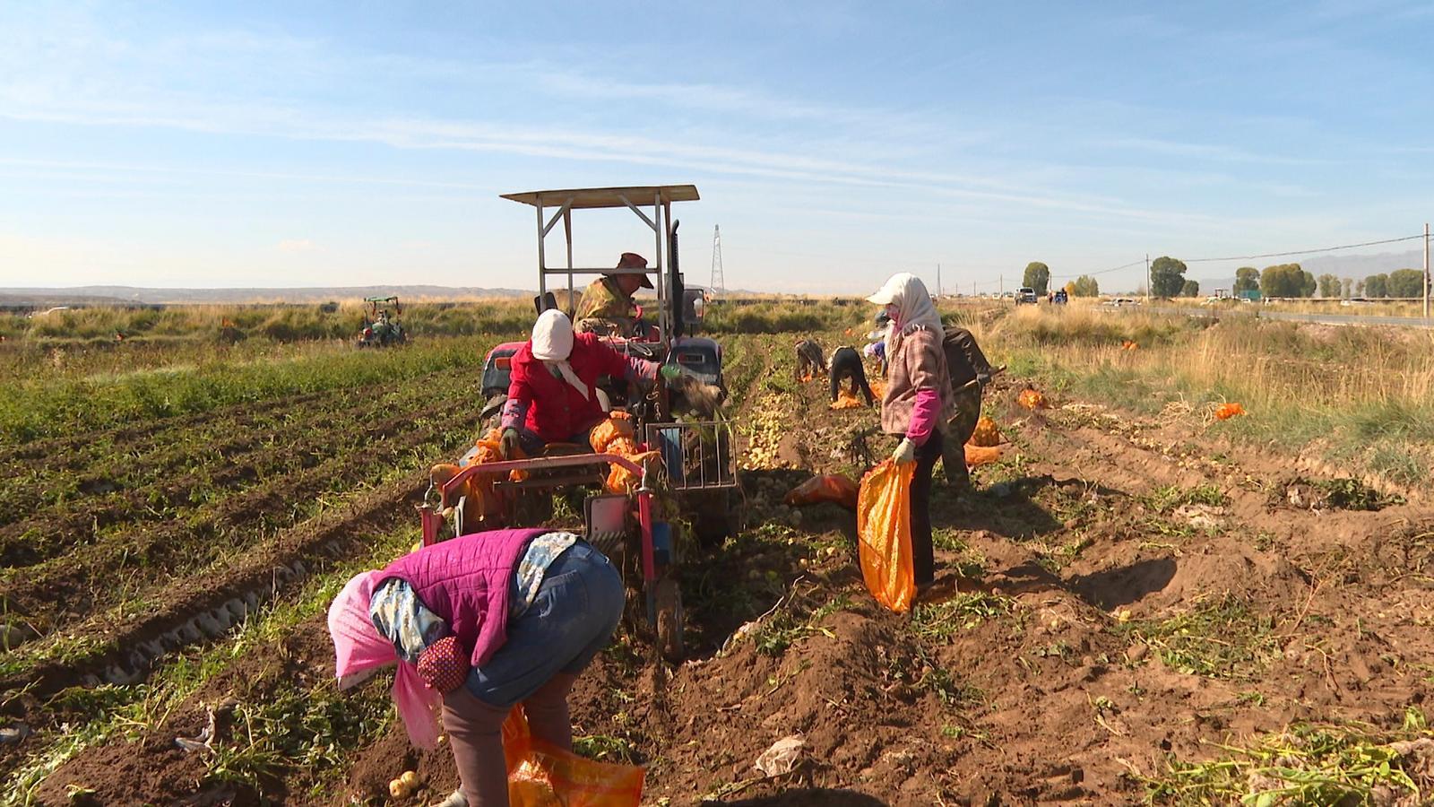 打秧机在田垅间飞驰而过,土豆秧匍匐在地。在打完秧的田地中,土豆收割机翻起湿润肥沃的土壤,坐在收割机上的工人扯出随土而出的地膜和秧蔓,一颗颗外观饱满、色泽明亮、沾着泥土的土豆跃然而出。工人们拿着编织袋手脚麻利地捡拾土豆,在他们身后一袋袋土豆整齐地排列在地头等待装车。