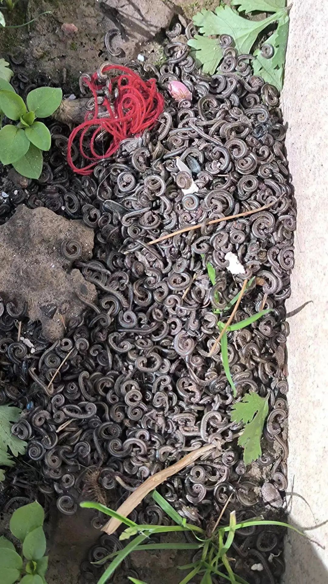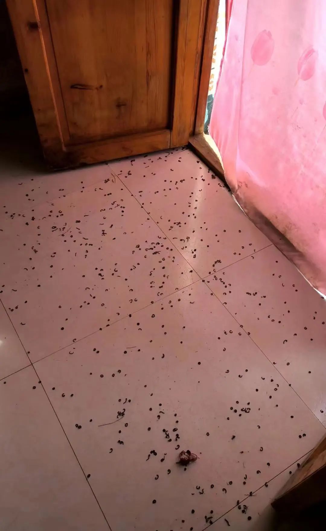 当事人李女士告诉记者,自己10月1日回到甘肃省张家川杨渠村老家,在家中平房独居休养,而这些虫子是2号晚上开始出现的,“从傍晚就开始往房间里爬,大概十一点时最多,虽然说爬不上炕,但软体的东西还是让人感觉害怕。”心惊肉跳地过完一晚后,第二天醒来李女士又要打扫满地的虫子。“早上醒来有死了的,也有半死不活还在爬的,多的时候能扫出来手掌大的一碗。”