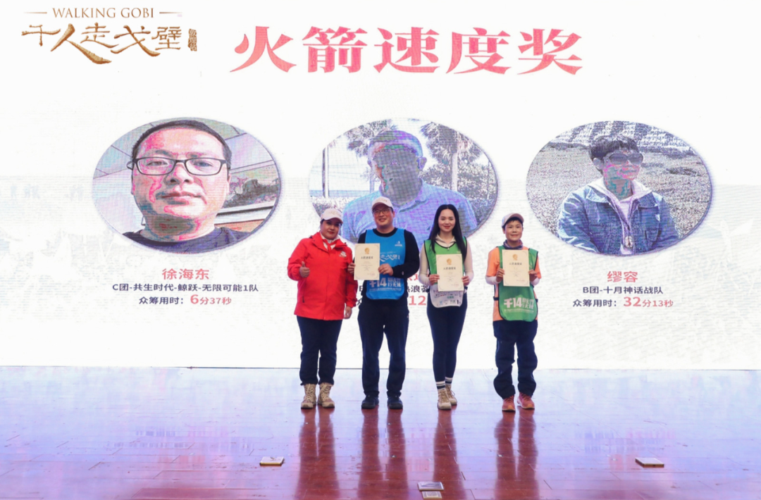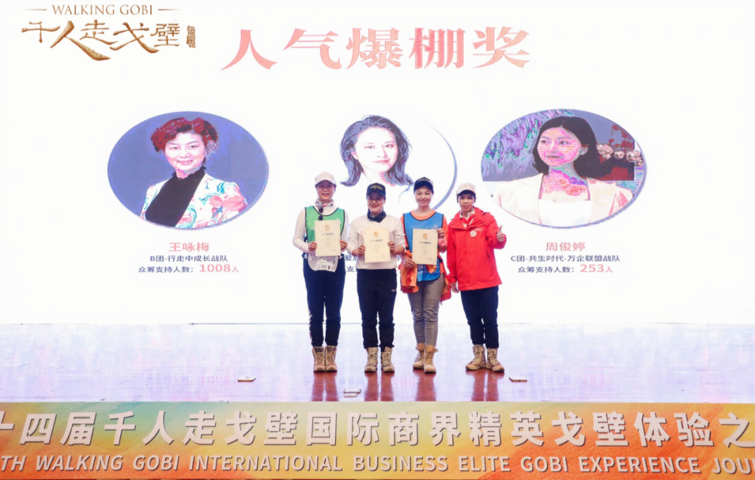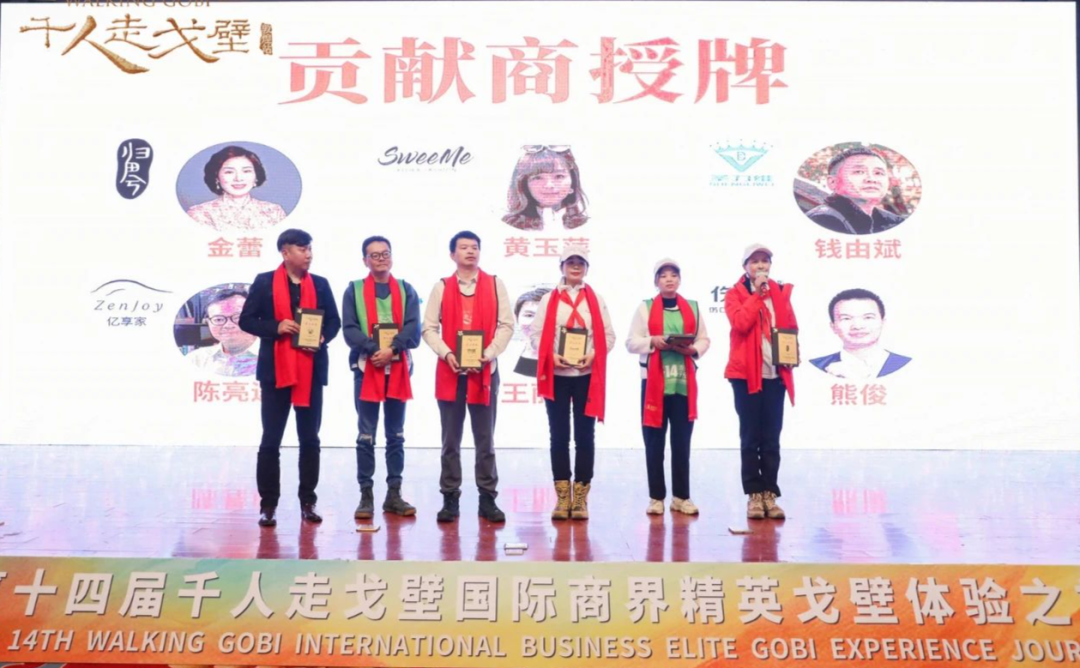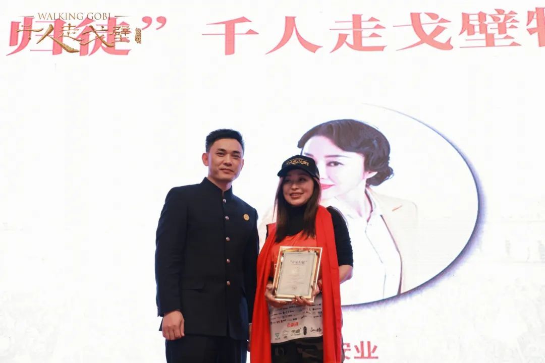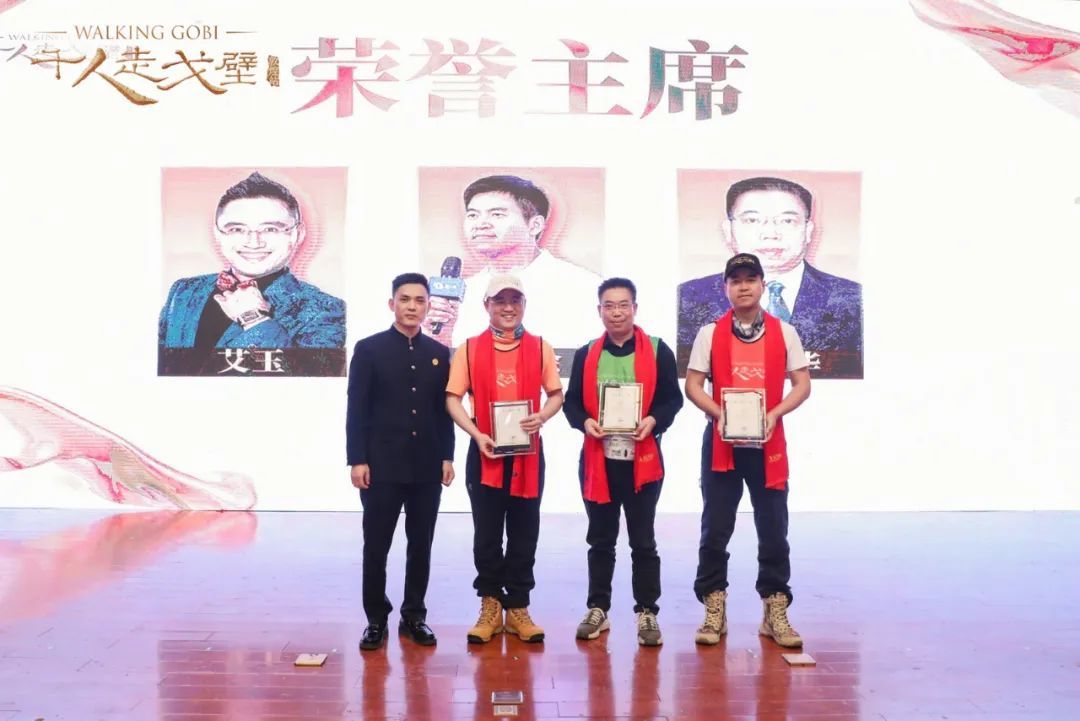 为表达对孔子书院副院长艾玉、随心瑜创始人兼CEO朱泰余、天府石油有限公司董事长卿建华对第十四届千人走戈壁活动促进作用的感谢,开幕式现场还为三人授予了“第十四届千人走戈壁赛事荣誉主席”的称号,并由赵总颁发奖牌。