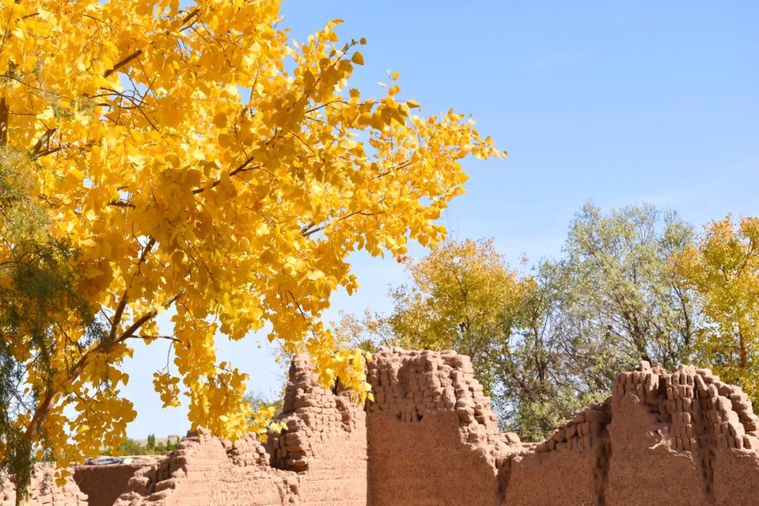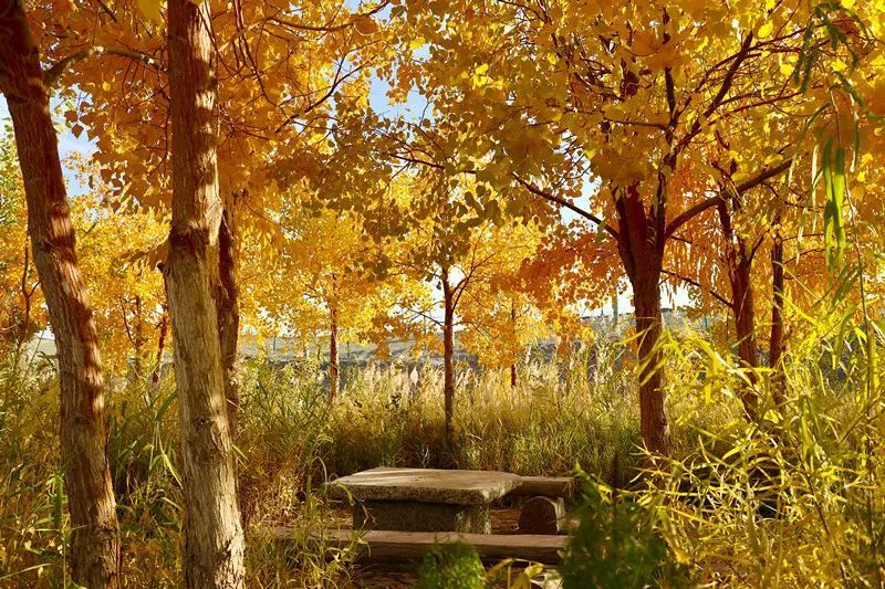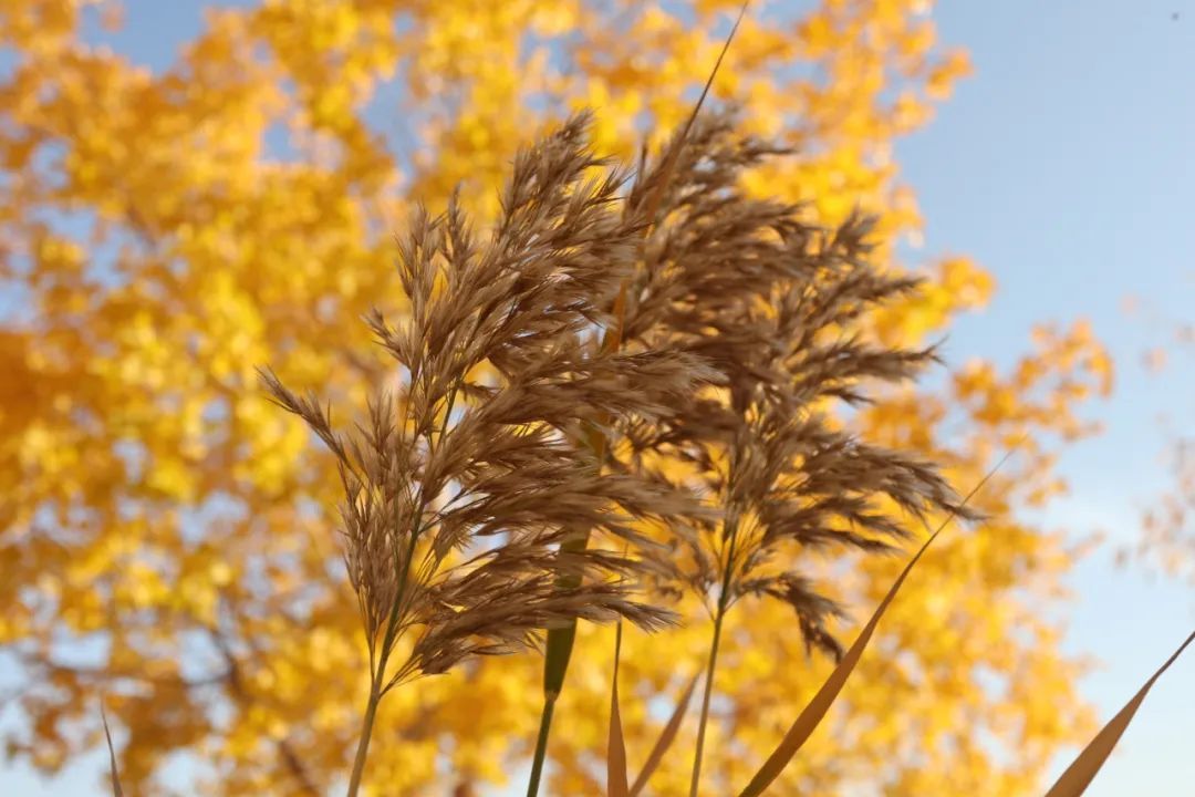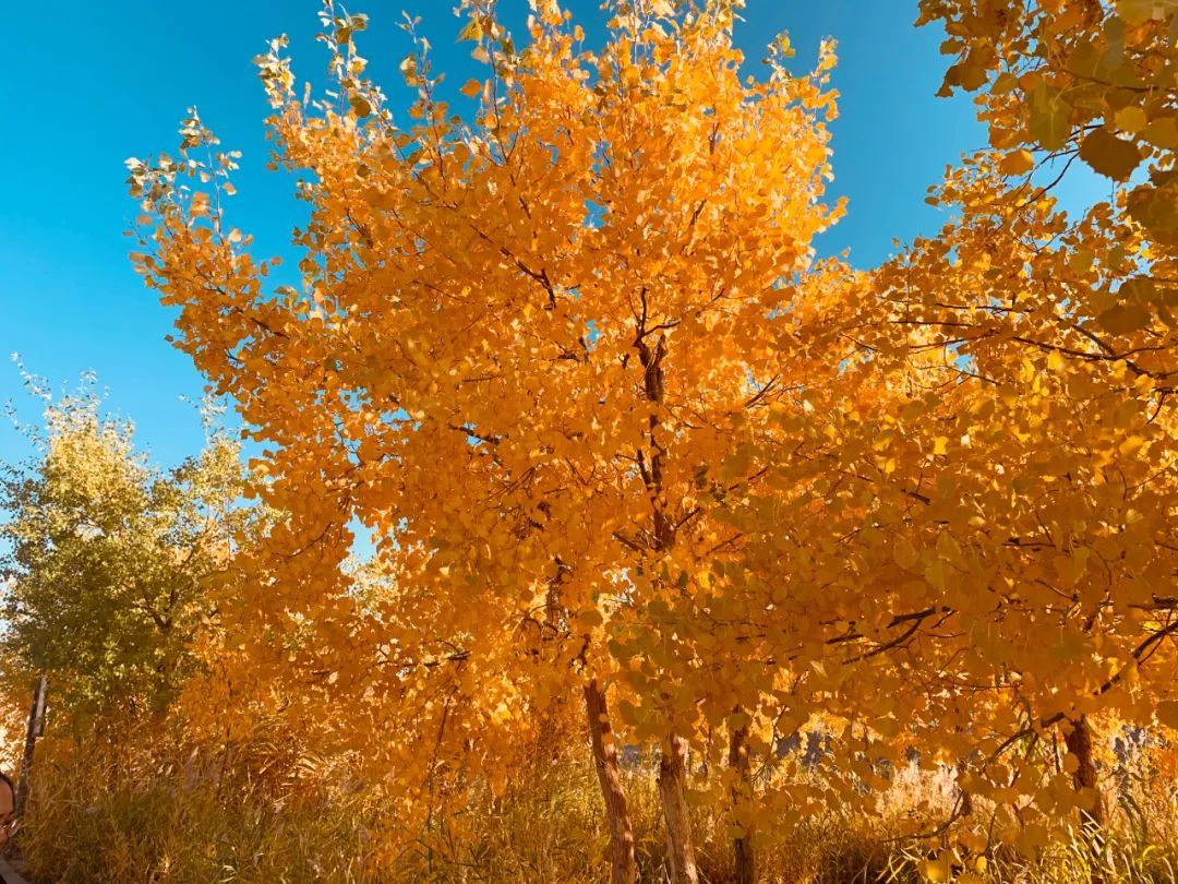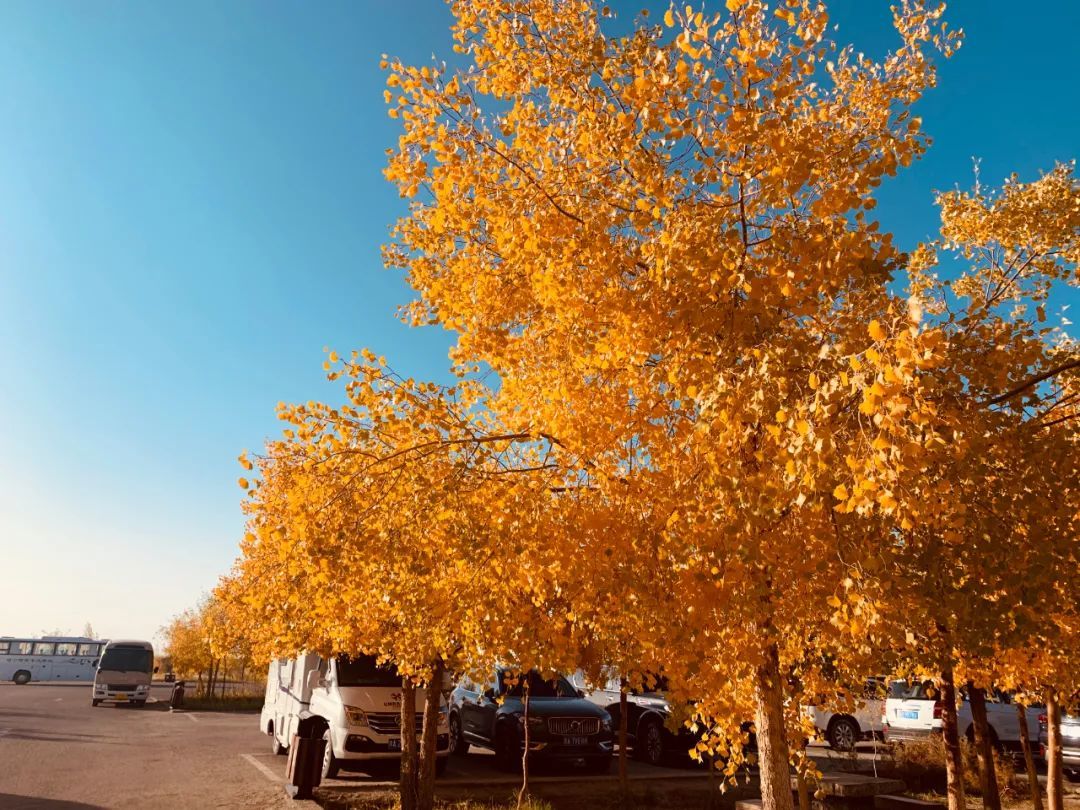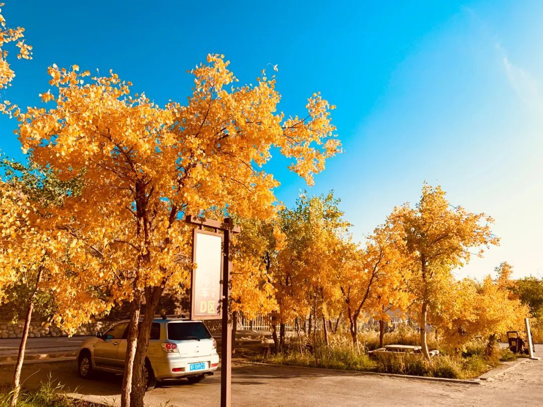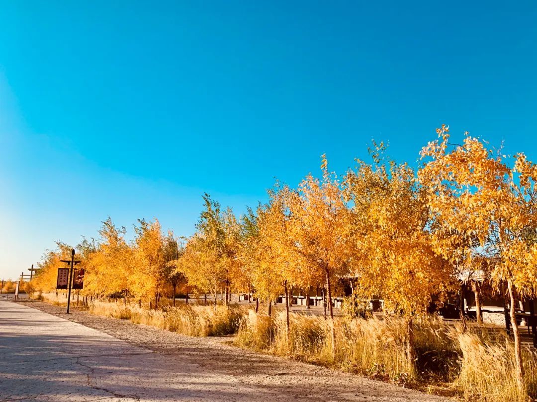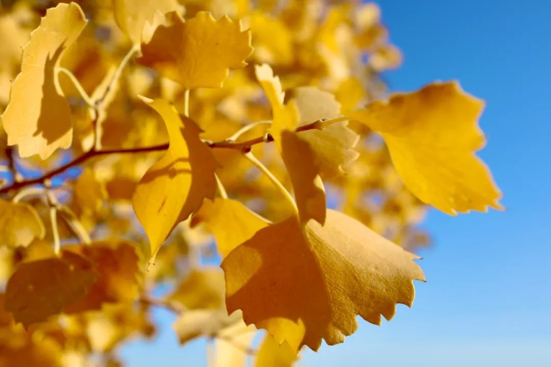 当秋日的阳光照射在胡杨树上时,每一片树叶都绽放生命的灿烂,为浩瀚无垠的大漠戈壁增添了一道美丽的风景线。