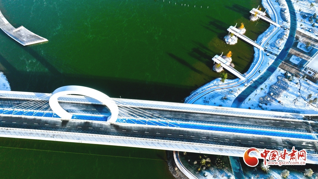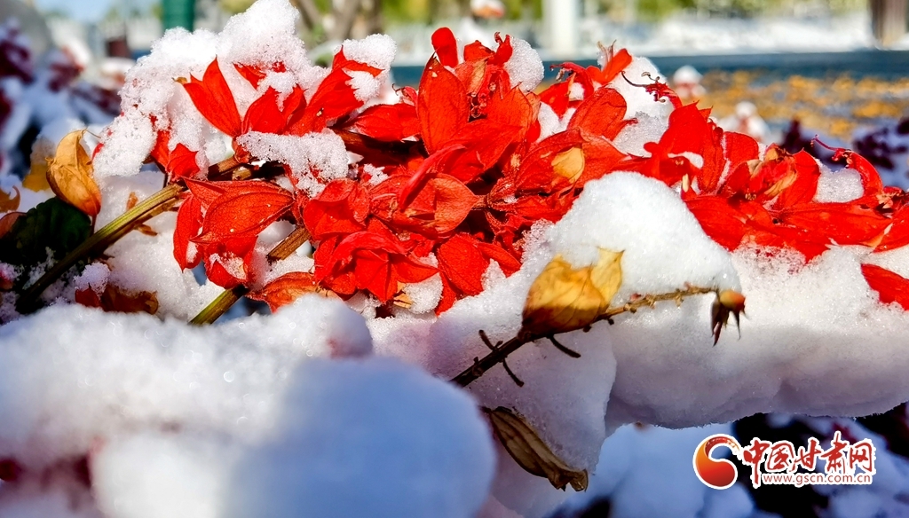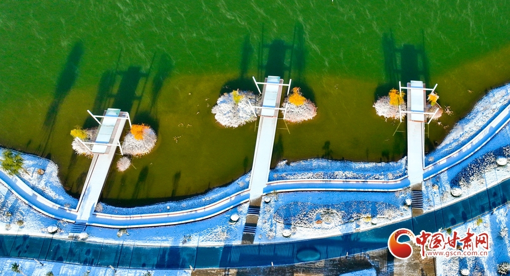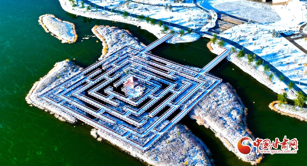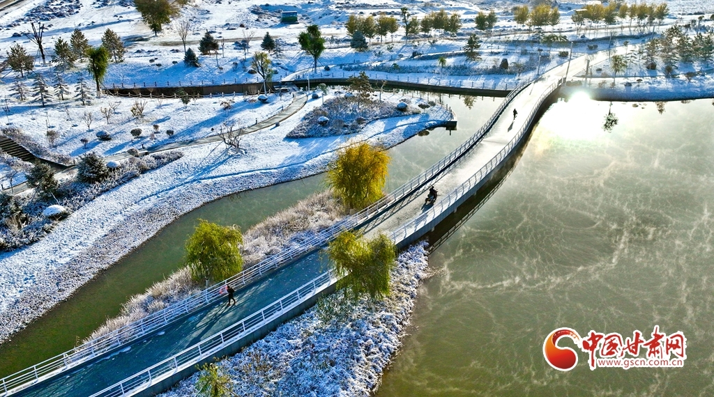 11月5日,受寒潮侵袭,甘肃省张掖市出现降温降雪天气。雪后初晴,张掖市中央文化公园内,银装素裹,景色迷人,宛若画卷。