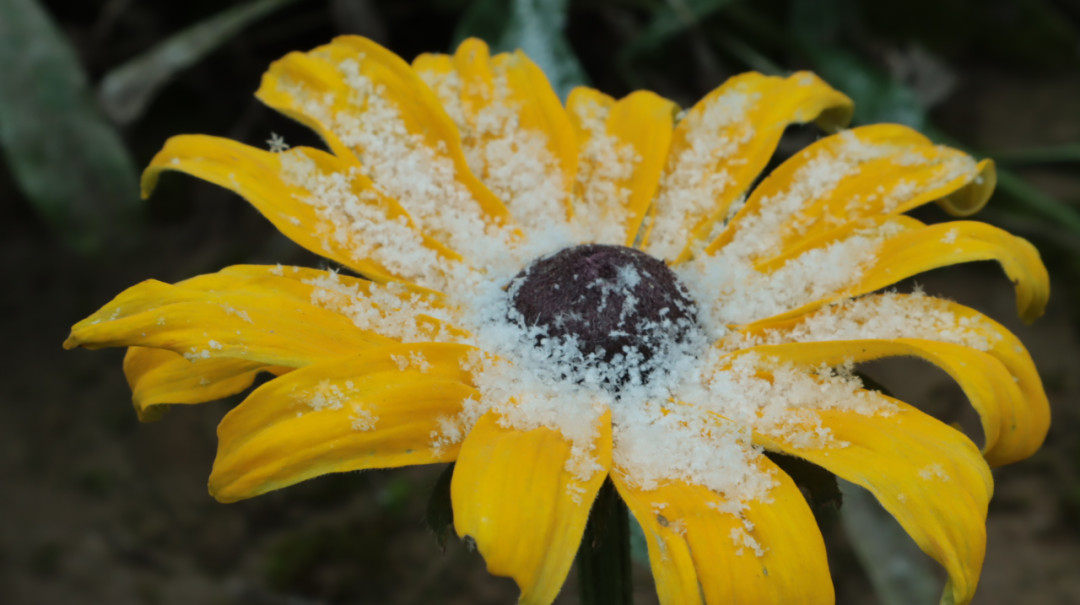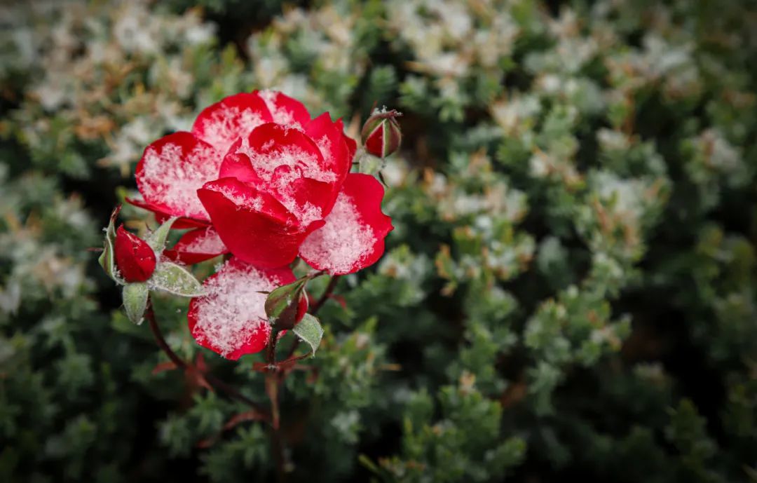 偶遇点缀上白色雪花的鲜花