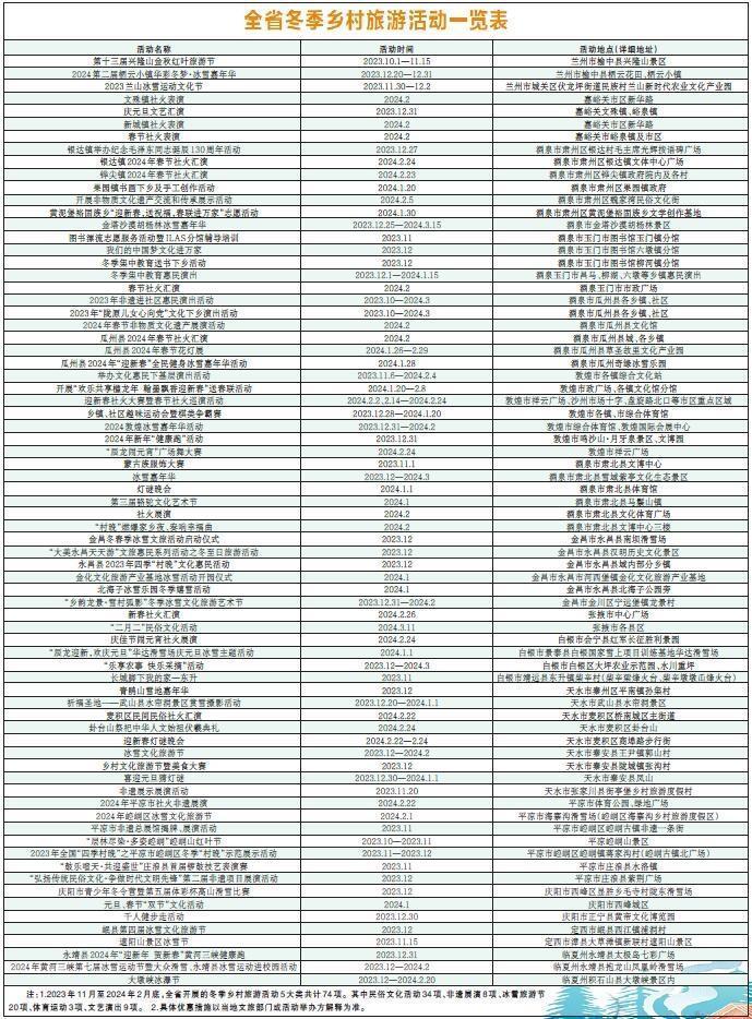 为不断丰富冬季优质乡村旅游产品供给,持续做热冬季乡村旅游市场,满足人民群众旅游消费需求,在2023年冬季来临之际,省文化和旅游厅结合全省各地乡土乡情、自然科普、农事体验、历史文化、冰雪娱乐、节庆活动、乡村振兴新风貌等旅游资源,推出了以“陇上乡遇·点燃冬日激情”为主题的100条冬季乡村旅游线路产品。这些形式多样的线路产品将带领游客观赏乡村冬景,品尝乡土美食,领略民俗文化的博大精深,壮大乡村休闲产业,促进乡村振兴。