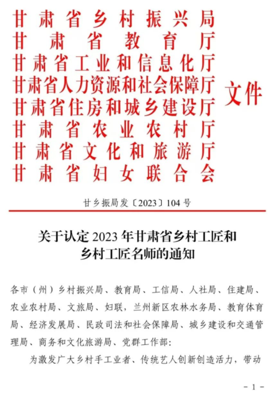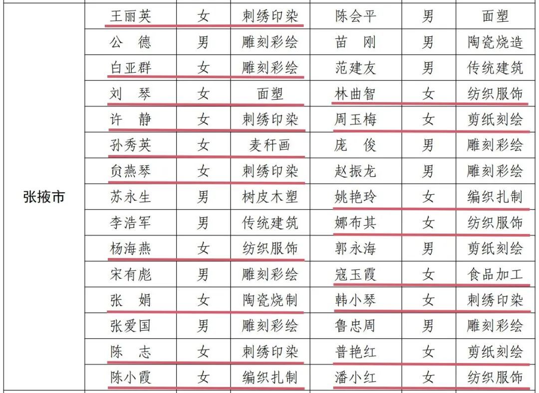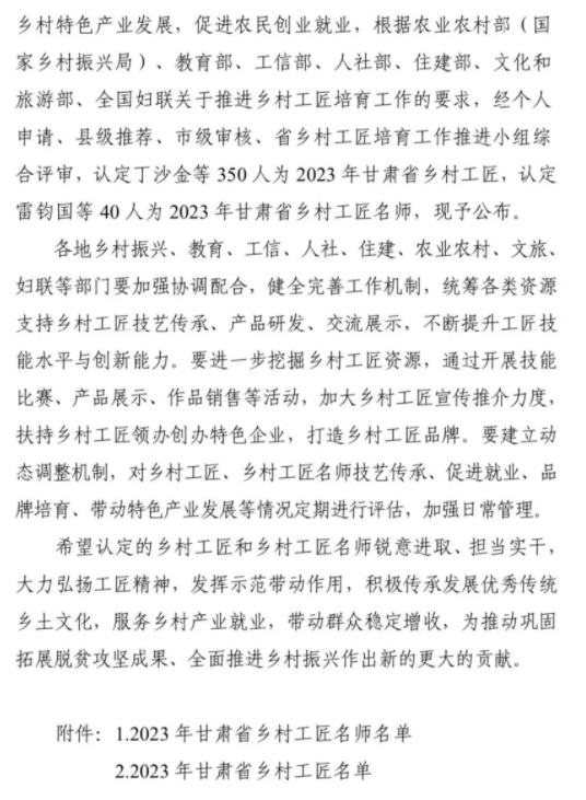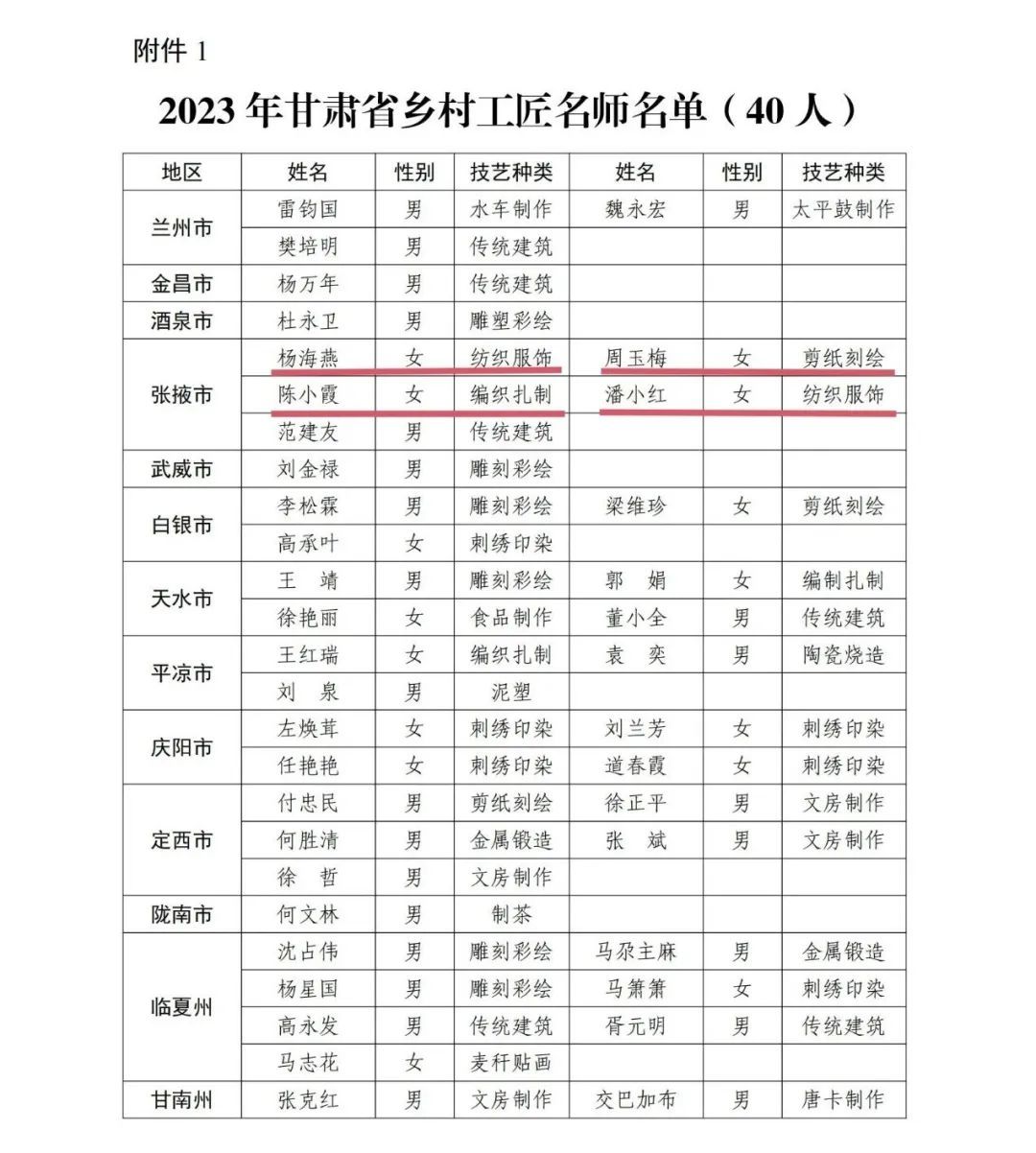 2023年甘肃省乡村工匠张掖市被认定30人,其中女性18人。