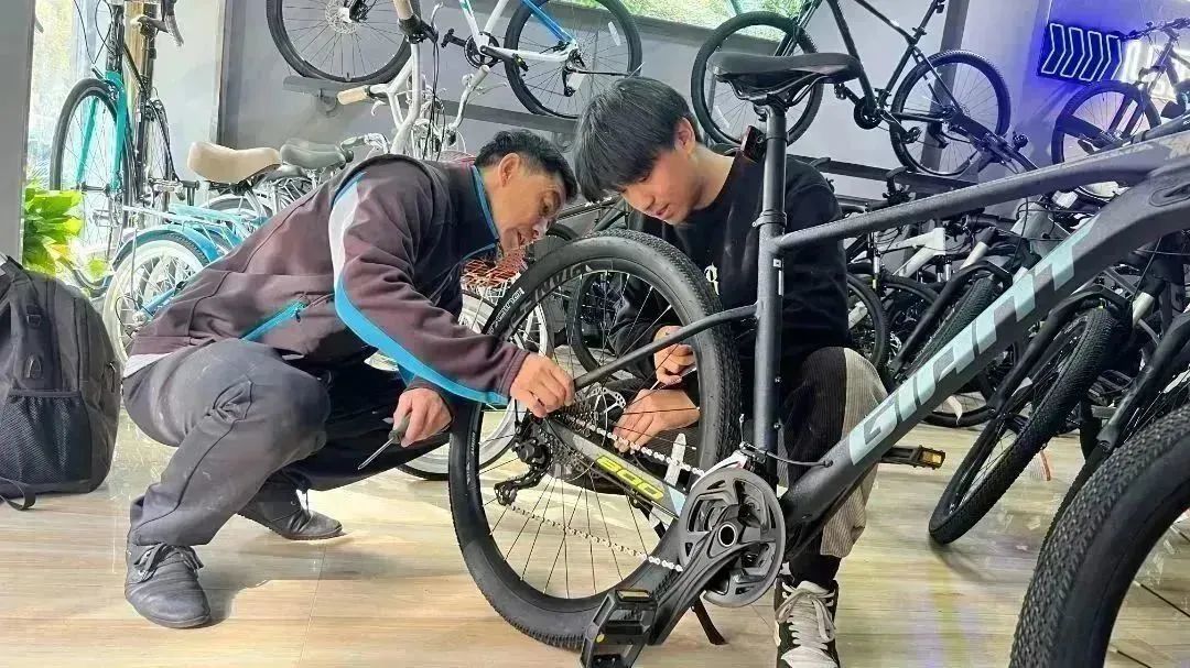 “组装、成品车、维修、配件、骑行装备我们都有。”受到父亲的耳濡目染,逯嘉诚从小就接触到了自行车行业。“现在店里自行车的受众大部分是学生,链条断了,胎没气了就会到这儿来,简单的问题都能处理,过来也很近,所以店里就有了修车,从销售到售后再到维修慢慢店里的生意也变好了。”逯嘉诚说。