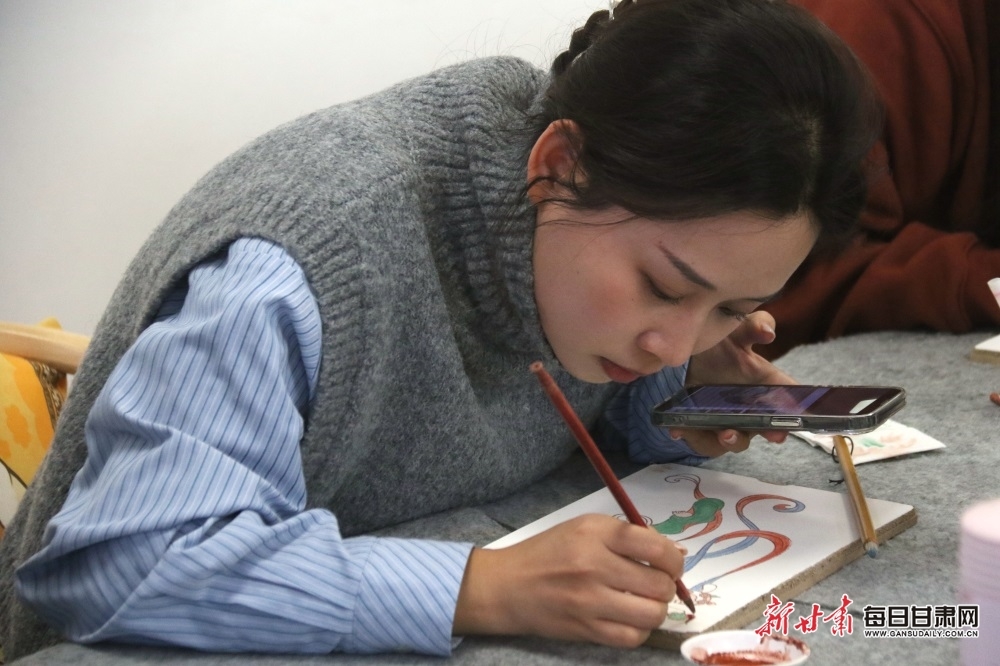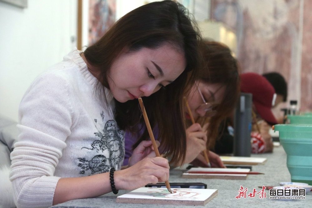 11月29日,在敦煌研究院莫高学堂,研学导师给学员讲授敦煌壁画临摹技法。