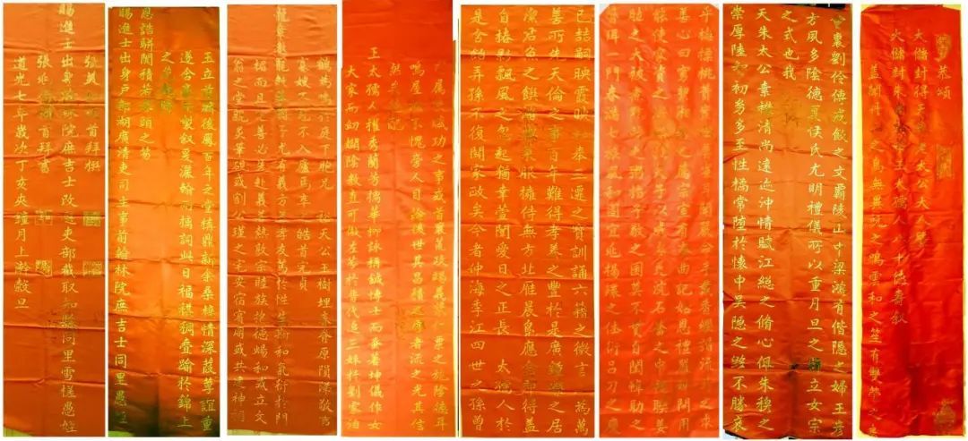 近日,在武威民间收藏的一套贺寿八联屏公诸于世。这套作品由八条屏组成,绸布材质泥金书写,清代武威县进士翰林张美如撰文、张兆衡书写,两大翰林联袂完成弥足珍贵。落款时间为道光七年(1827年)二月上旬。