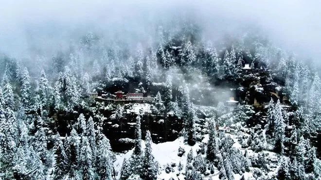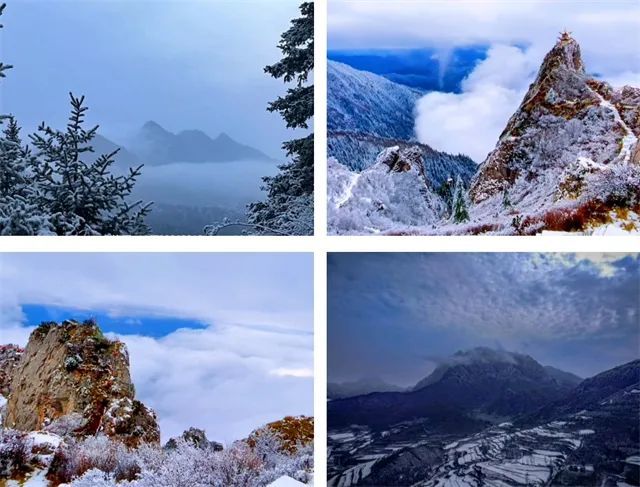 雪悄无声息地降落在松鸣岩林壑之上,远处眺望,苍茫的山峰,如屋顶积雪,四下银白。铺琼砌玉,青白相间,妖娆多姿。