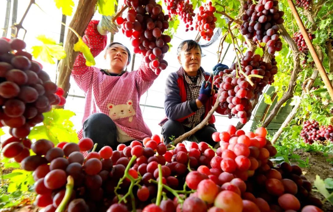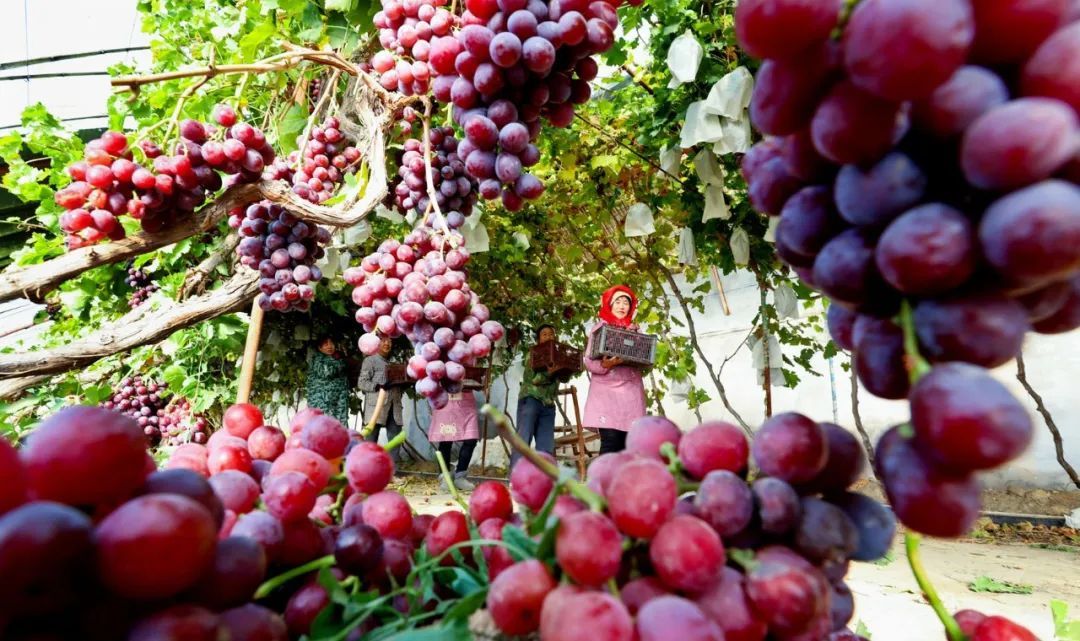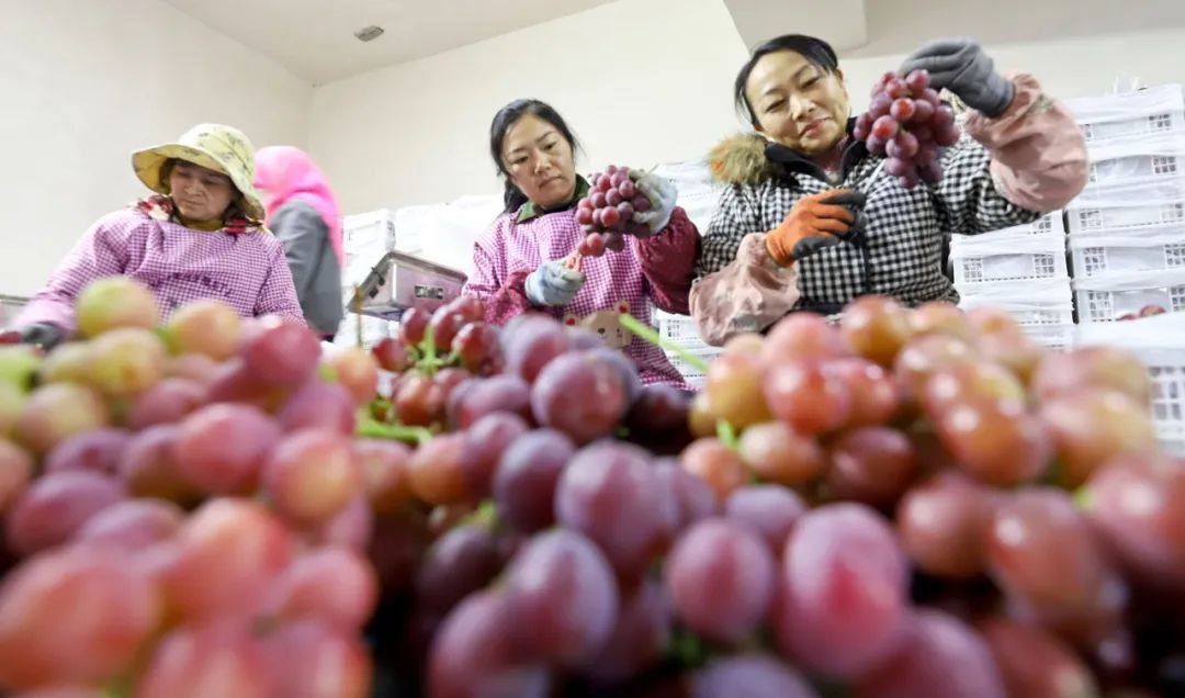 12月11日,临泽县沙河镇兴科荒漠区设施农业示范园100多亩错季葡萄种植大棚内,种植户们正在紧张忙碌地采摘错季红提葡萄。