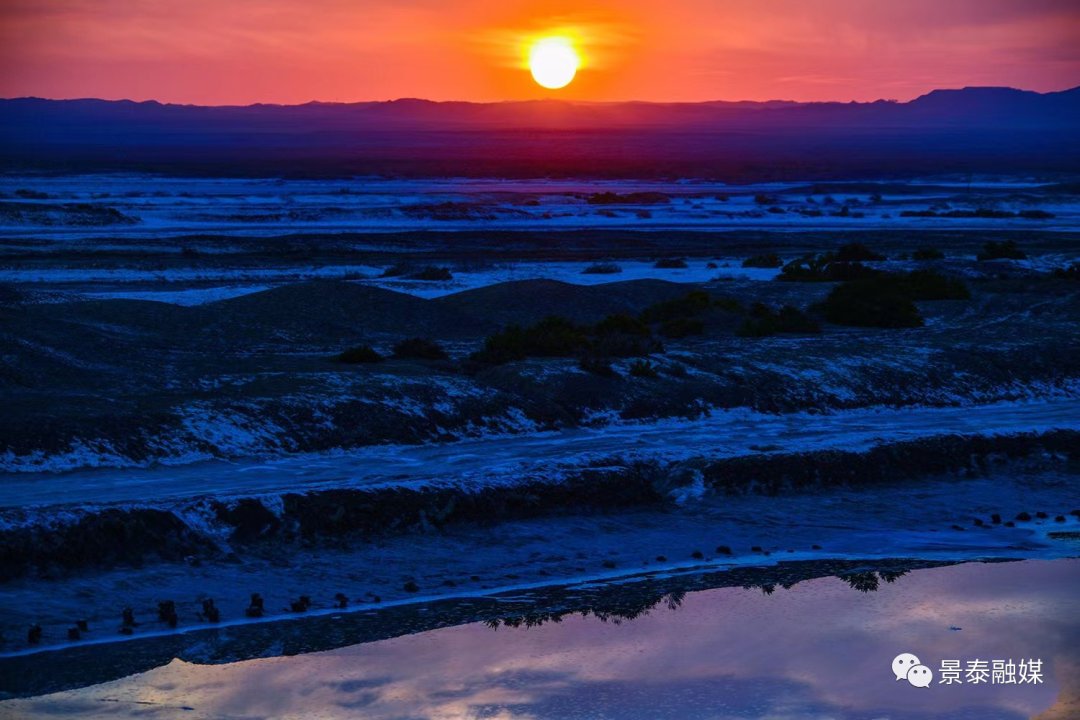 寻一处地方,静静地,看一轮红日从天空慢慢没入地平线。此时的戈壁,寂寥又绚烂,湖中的涟漪享受着这温暖的余晖,赤麻鸭在水中叫着。极目远眺,几架飞机从空中飞过,机翼拂过宁静的天空,留下丝丝痕迹。