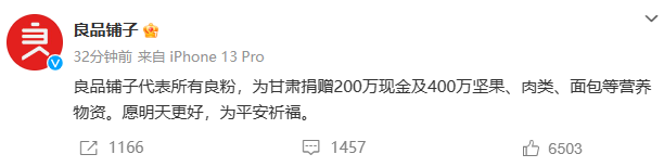 良品铺子发文表示:代表所有良粉,为甘肃捐赠200万现金及400万坚果、肉类、面包等营养物资。