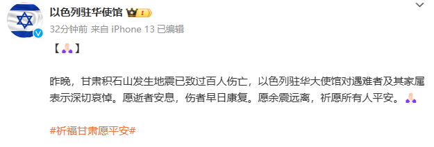 以色列驻华使馆表示:昨晚,甘肃积石山发生地震已致过百人伤亡,以色列驻华大使馆对遇难者及其家属表示深切哀悼。愿逝者安息,伤者早日康复。愿余震远离,祈愿所有人平安。