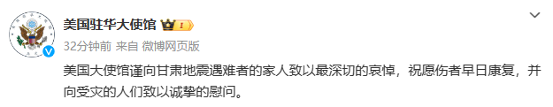 美国驻华大使馆表示:美国大使馆谨向甘肃地震遇难者的家人致以最深切的哀悼,祝愿伤者早日康复,并向受灾的人们致以诚挚的慰问。
