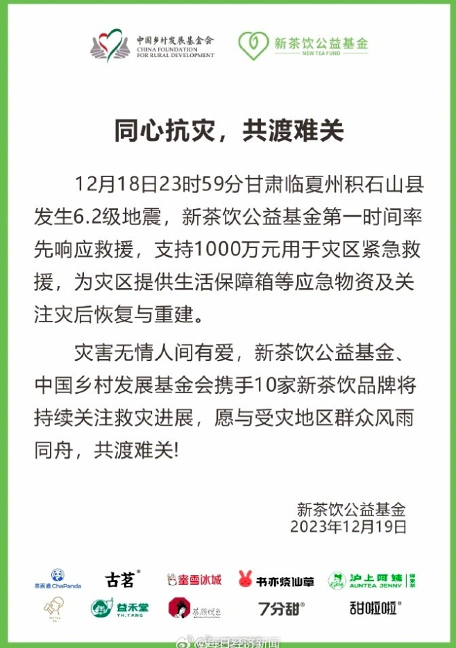 @新茶饮公益基金捐赠1000万元驰援甘肃地震!甘肃临夏州积石山县发生6.2级地震后,新茶饮公益基金携手10家新茶饮品牌第一时间响应紧急救援工作,为灾区提供生活保障箱等应急物资。