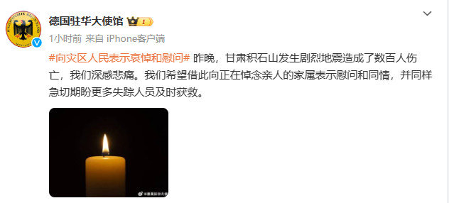 德国驻华大使馆表示:昨晚,甘肃积石山发生剧烈地震造成了数百人伤亡,我们深感悲痛。我们希望借此向正在悼念亲人的家属表示慰问和同情,并同样急切期盼更多失踪人员及时获救。