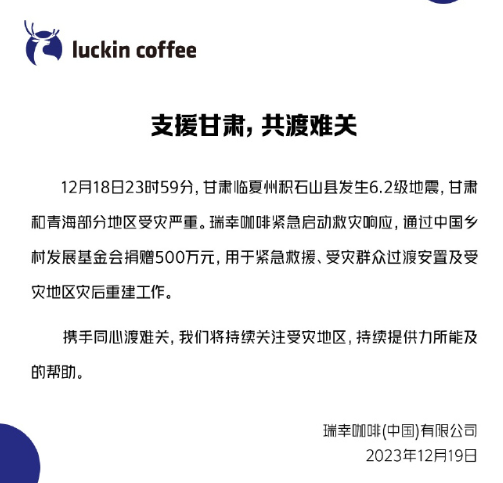 @luckincoffee瑞幸咖啡:12月18日23时59分,甘肃临夏州积石山县发生6.2级地震,甘肃和青海部分地区受灾严重。瑞幸咖啡紧急启动救灾响应,通过中国乡村发展基金会捐赠500万元,用于紧急救援、受灾群众过渡安置及受灾地区灾后重建工作。