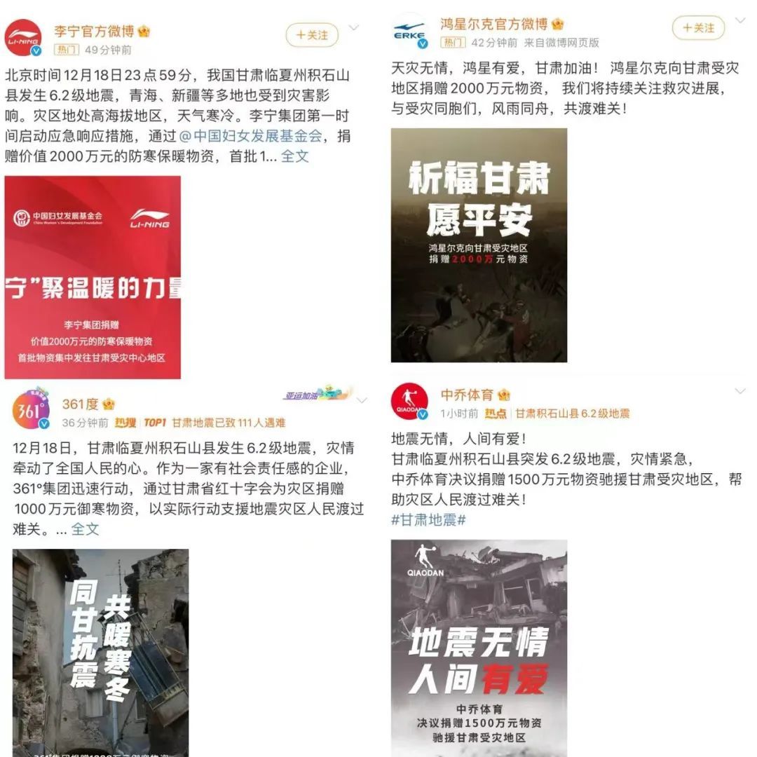 12月18日23点59分,甘肃临夏州积石山县发生6.2级地震。目前,已有多家企业向甘肃地震灾区捐款捐物。包括医疗健康、餐饮企业、体育服装等多个行业。