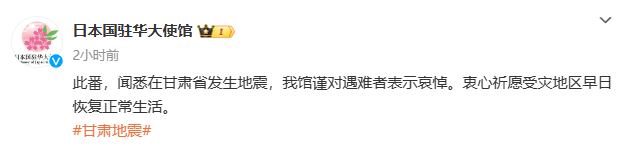 日本驻华大使馆表示:此番,闻悉在甘肃省发生地震,我馆谨对遇难者表示哀悼。衷心祈愿受灾地区早日恢复正常生活。