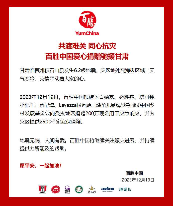 2023年12月19日,百胜中国携旗下肯德基、必胜客、塔可钟、小肥羊、黄记煌、Lavazza拉瓦萨、烧范儿品牌紧急通过中国乡村发展基金会向受灾地区捐赠200万现金用于应急响应,并为灾区提供2500个家庭保障箱。