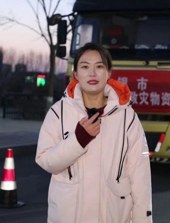 “现在是12月21日的清晨,在我身后送往震区的物资车已经全部集结完毕。由于考虑到积石山县地处高海拔区域,气候比较寒冷,所以除了准备的米、面、粮、油等生活物资以外,还准备了棉大衣、棉被、活动板房等御寒物资。今天上午,物资车将准时从白银出发,把温暖送向灾区。”