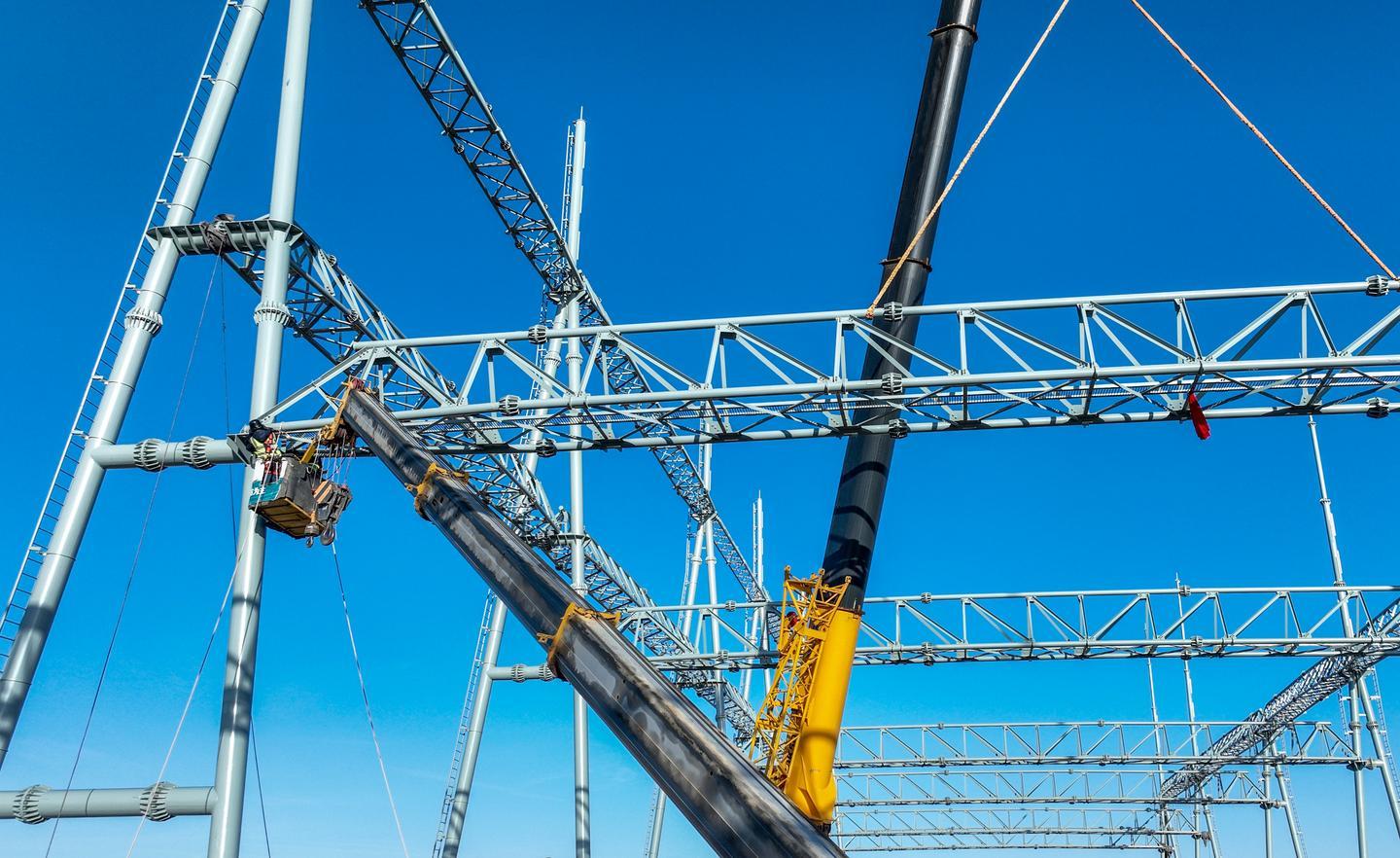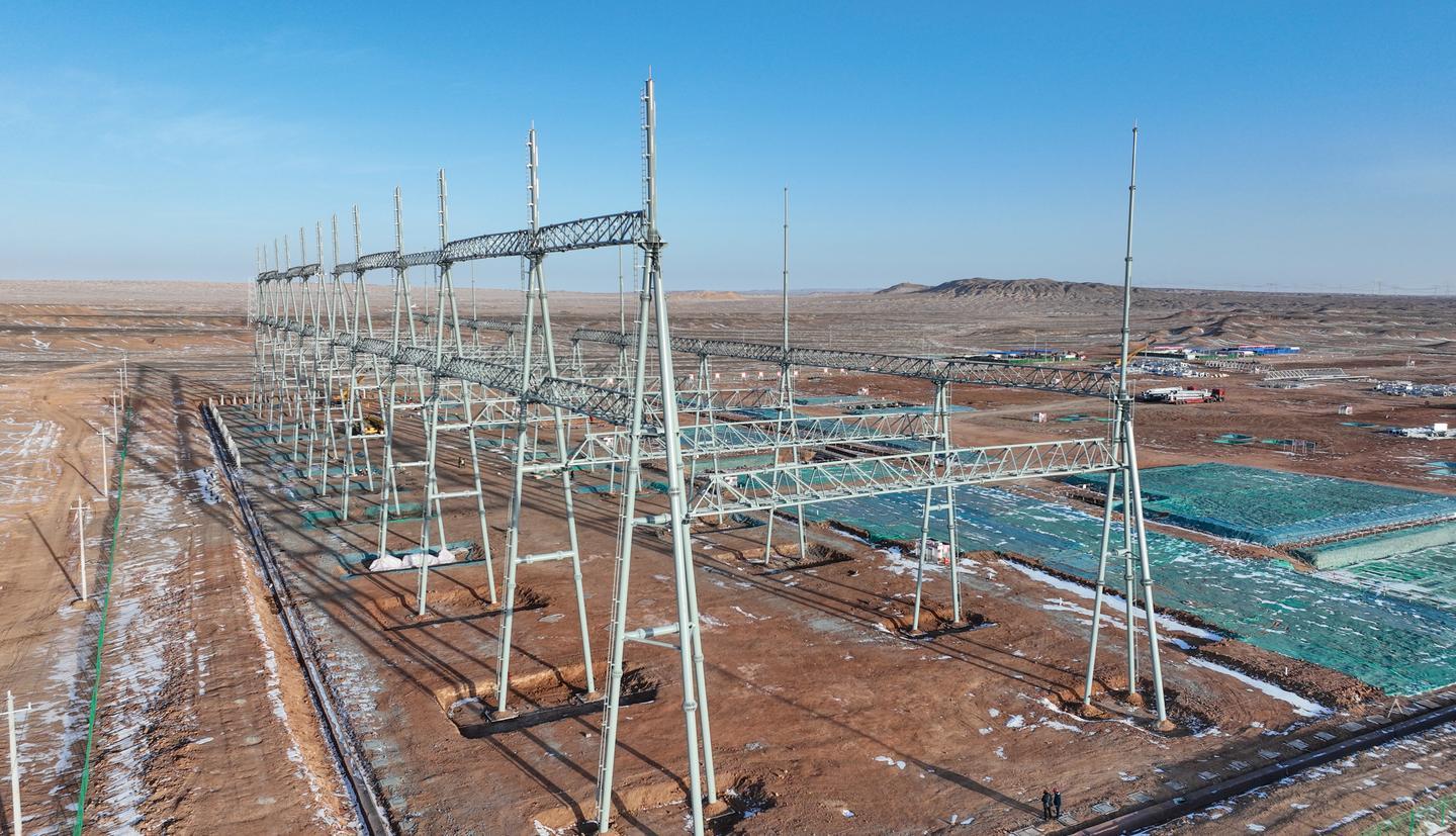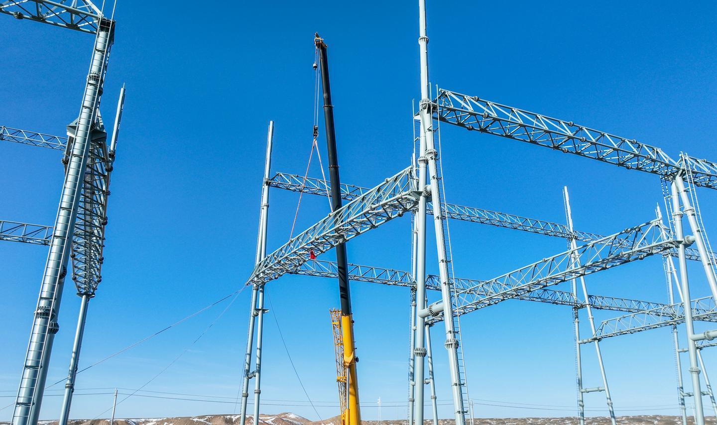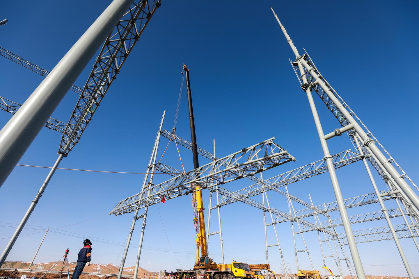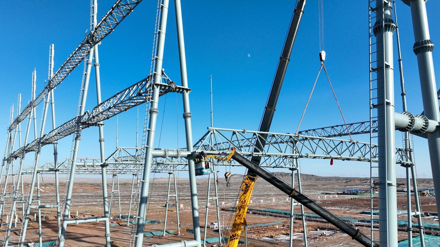 12月21日,金塔750千伏变电站工程330千伏构架吊装现场,大型起重吊车挥动巨型铁臂进行钢梁吊装,吊车将钢梁安置在预定位置后,作业人员紧固螺丝,构架钢梁吊装到位。