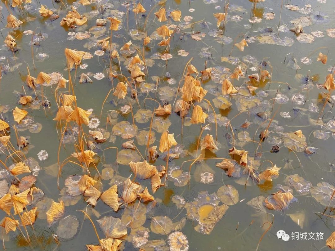 冬日,最美莫过于一池残荷了。泛黄的荷叶、低头的莲蓬,以另一种姿态展现在游人面前,都在诉说着,虽残破仍淡然静立,虽败落也洒脱自然。