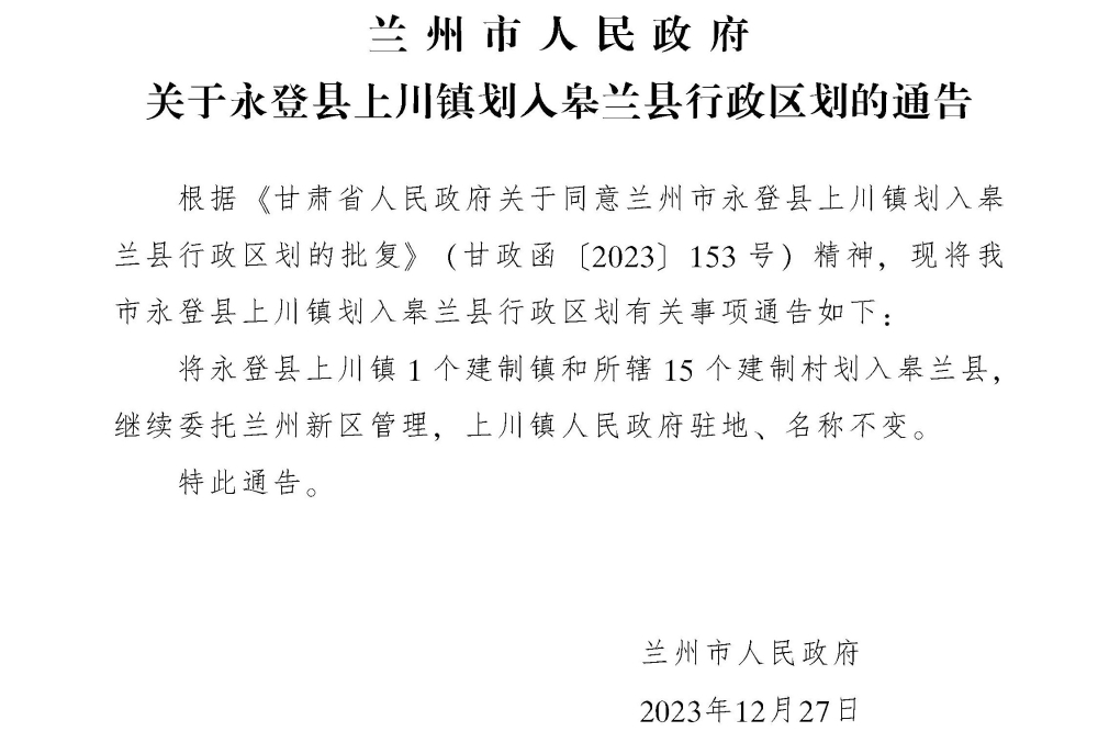 兰州市人民政府关于永登县上川镇划入皋兰县行政区划的通告