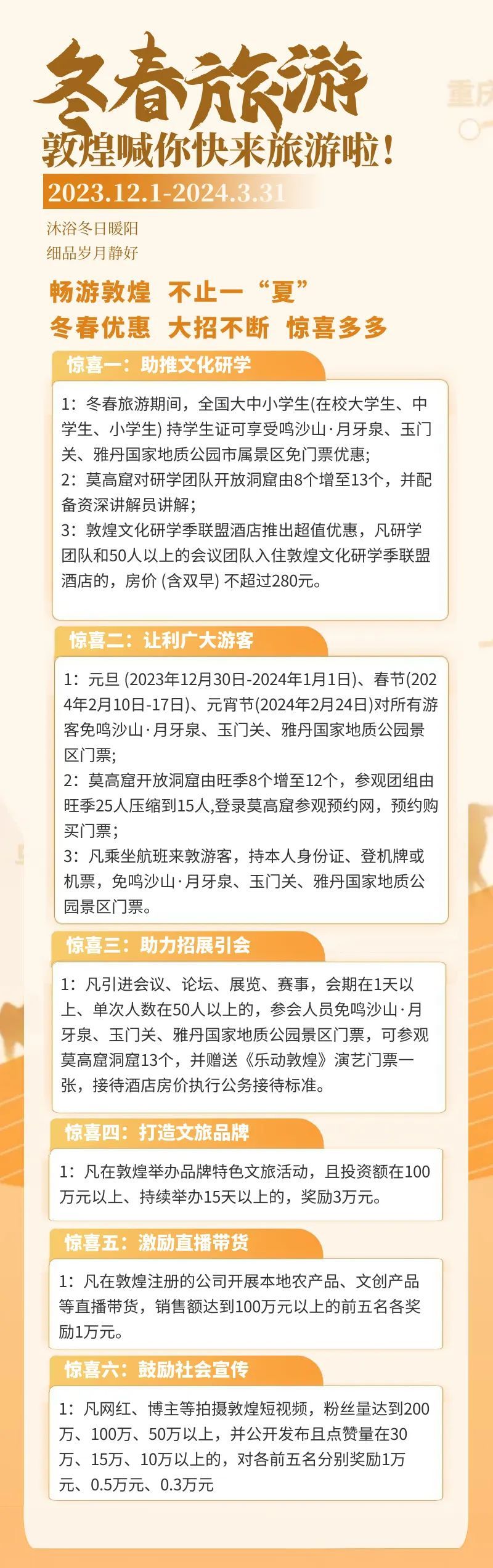 冬春季是敦煌的旅游淡季,游客相对较少,你可以更加轻松地欣赏到敦煌的美景,不用担心人山人海的拥挤。而且,敦煌的门票在冬春季也会有一定的优惠,这无疑为你的旅行节省了开支。