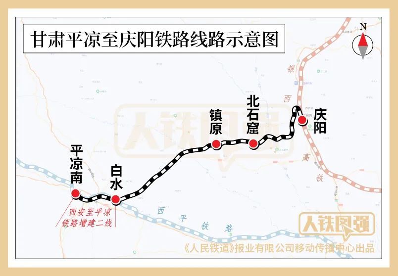 平庆铁路位于甘肃东部地区,线路全长约92公里,为国家Ⅰ级双线客货共线电气化铁路,自平凉市崆峒区平凉南站引出,经平凉市崆峒区、庆阳市镇原县、庆阳市西峰区,接入银川至西安高铁庆阳站,其中平凉南至白水段沿西安至平凉铁路增建二线,长约12公里,设计时速120公里;白水至庆阳段为新建双线铁路,长约80公里,设计时速160公里。平庆铁路共设平凉南、白水、镇原、北石窟、庆阳5座车站,其中平凉南、庆阳为既有车站,其他为新建车站,建设工期4.5年。