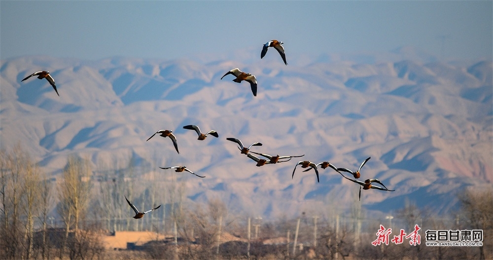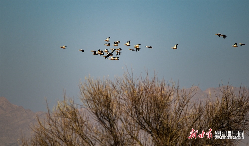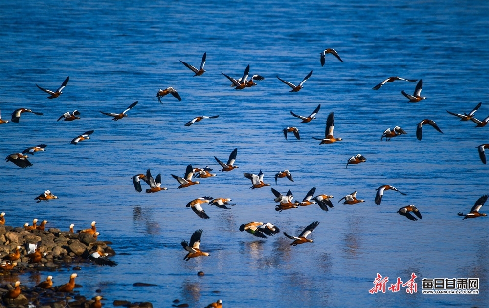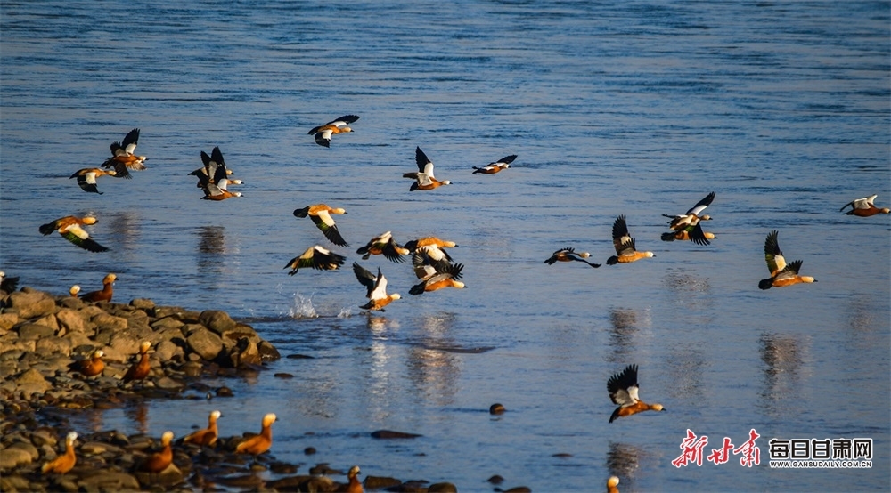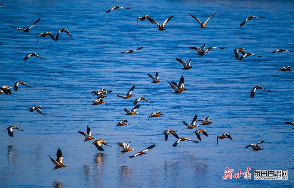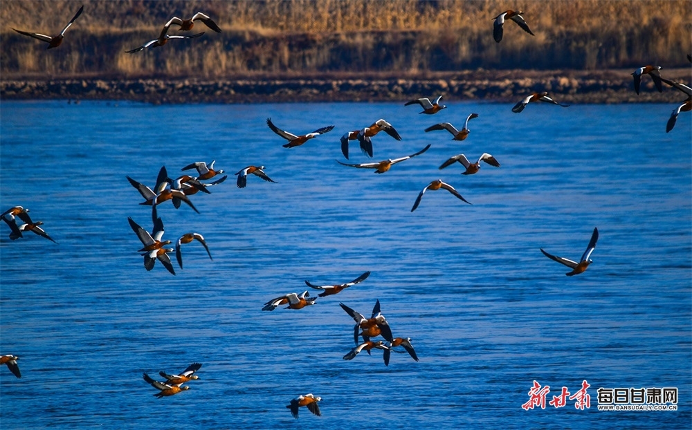 每日甘肃网:快来观赏!成群赤麻鸭“做客”景泰黄河湿地