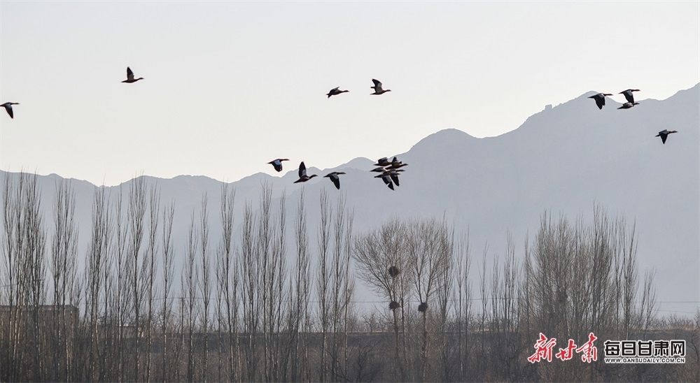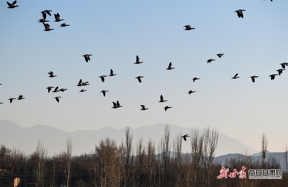 1月3日下午,黄河上游白银景泰县五佛乡境内,成群结队的赤麻鸭逐水而居,或在河湾沐浴着温暖的夕阳,或飞过河面、树梢、田野。近年来,在此越冬的国家二级保护动物赤麻鸭数量逐年增多。