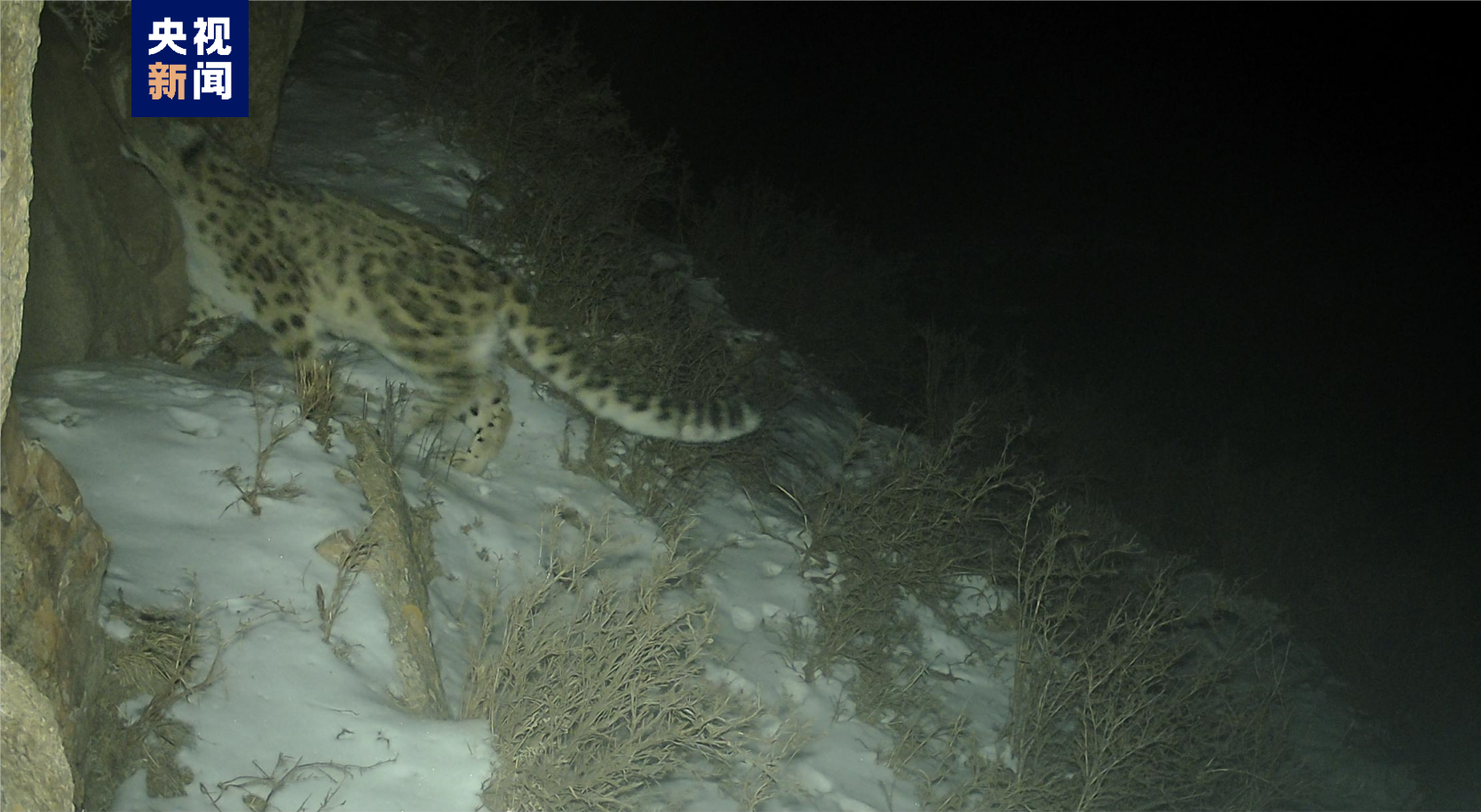 此次被拍摄到的是一只成年雪豹,体形匀称、步履矫健,黑夜中它贴着岩石边行走,拍摄时间是2023年11月27日。据了解,这是该区域首次拍摄到雪豹。