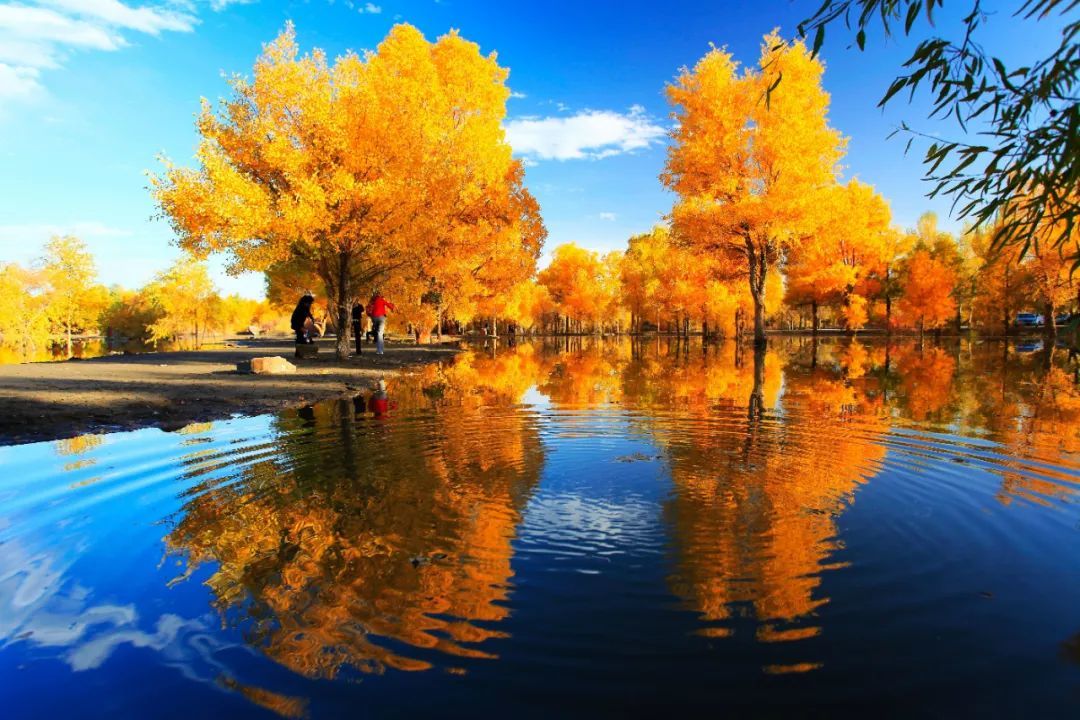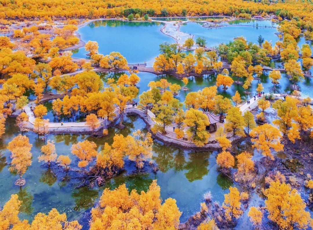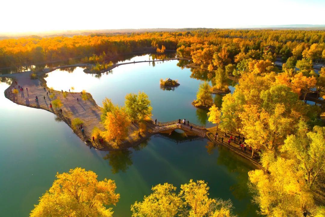 秋天,迷人的胡杨林层林尽染,游客从四面八方纷至沓来,漫步在金塔沙漠胡杨林中,仿佛置身于金色的世界,待一路阳光冲破云层的光影时,这里便成了梦想畅游的“诗和远方”。