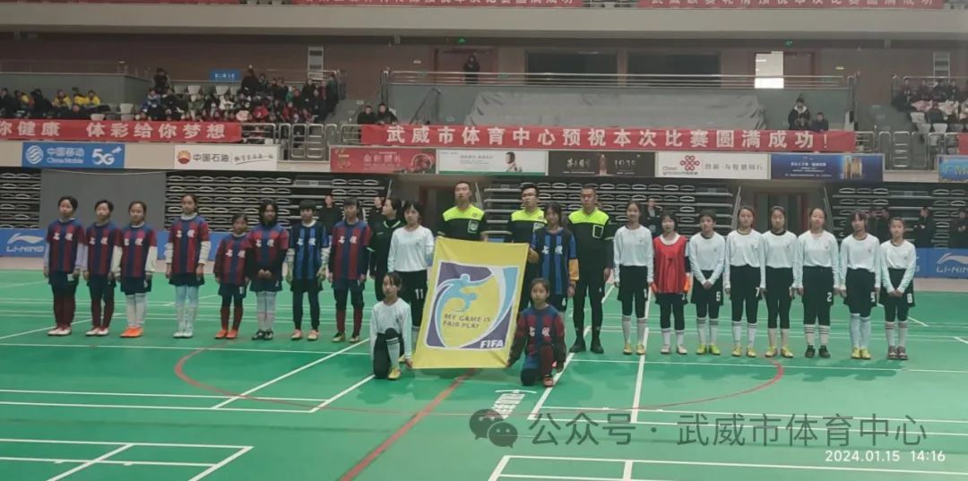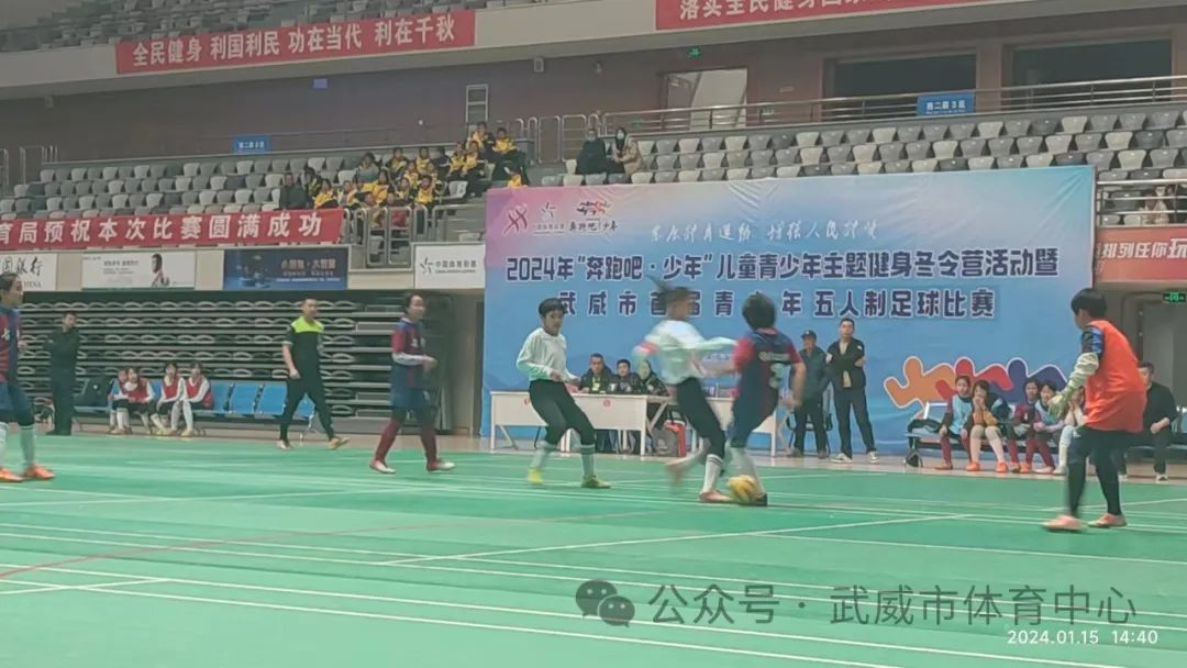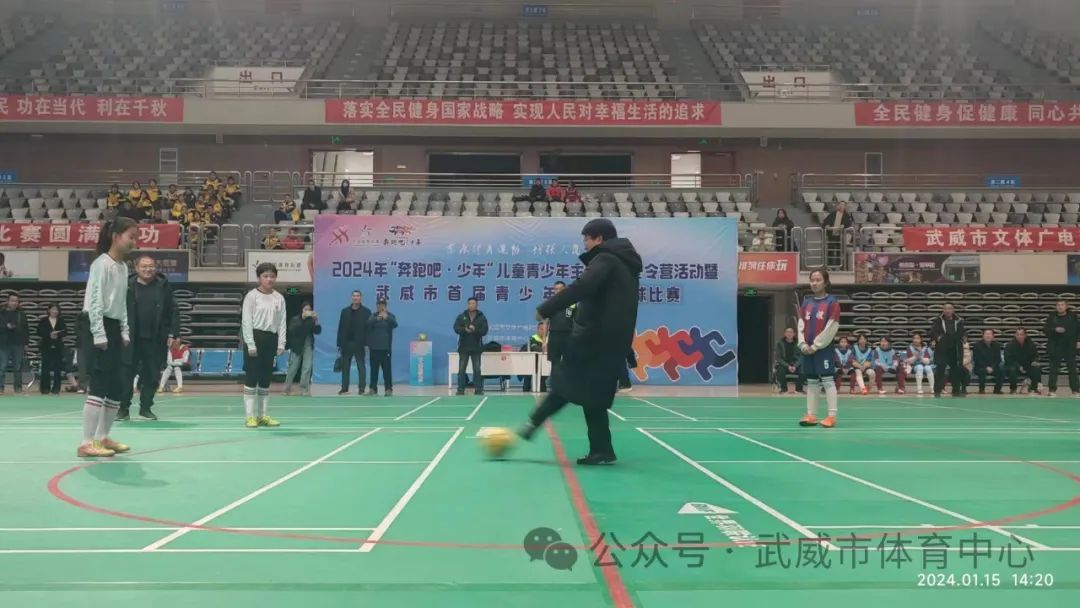 1 月 15 日,武威市2024年“奔跑吧·少年”儿童青少年主题健身冬令营活动暨首届青少年五人制足球比赛在武威市体育馆举办,来自全市三县一区11支代表队的 217名运动员、教练员和裁判员参加本次比赛。